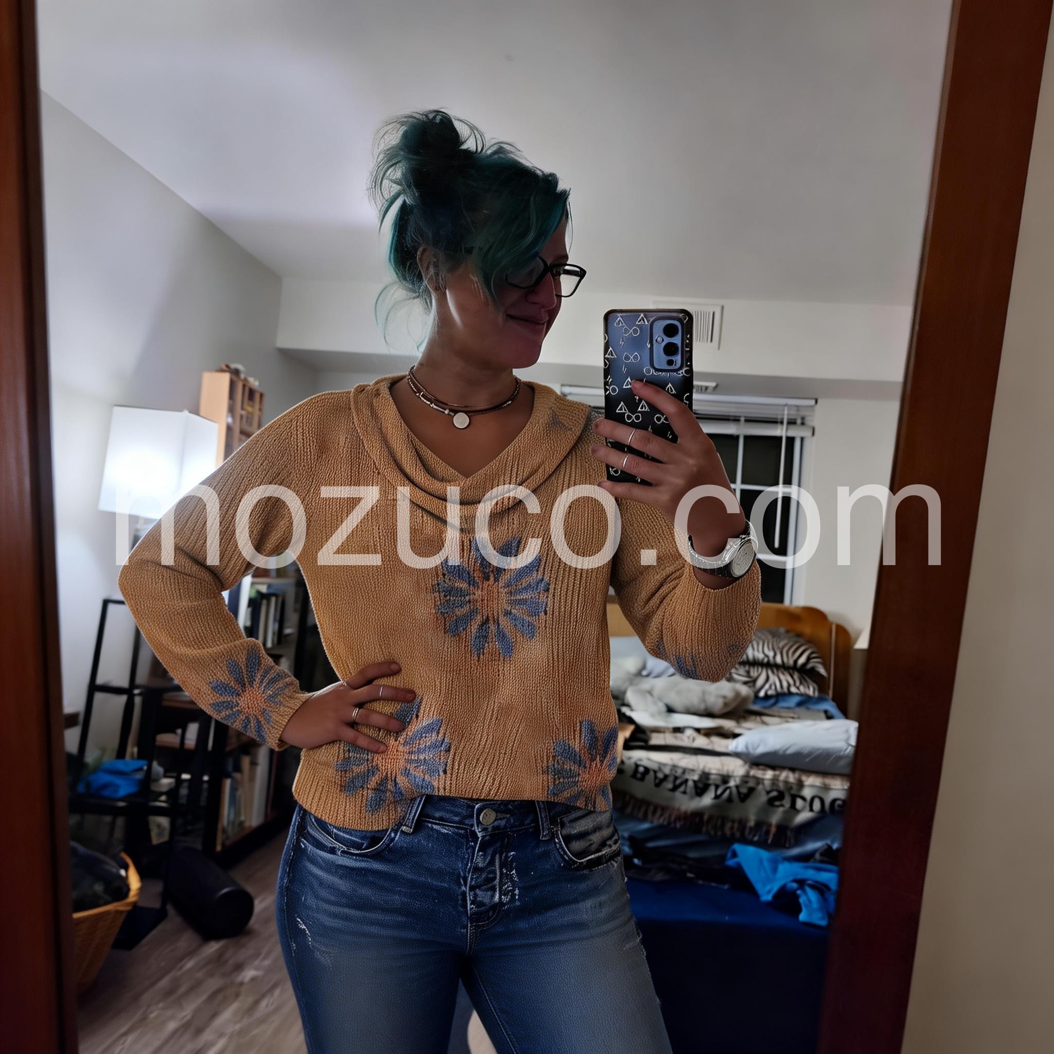 I absolutely love this sweater! The cowl neck is so flattering and the warm brown color is perfect for fall. The little blue floral designs add such a cute touch. Fits true to size and looks great with jeans.