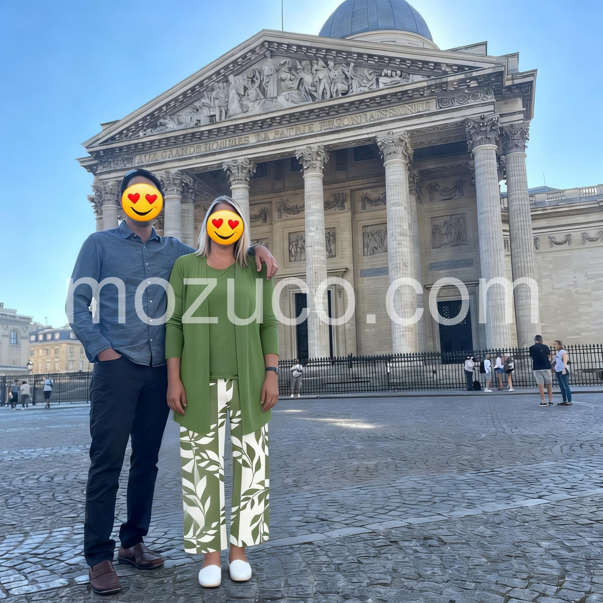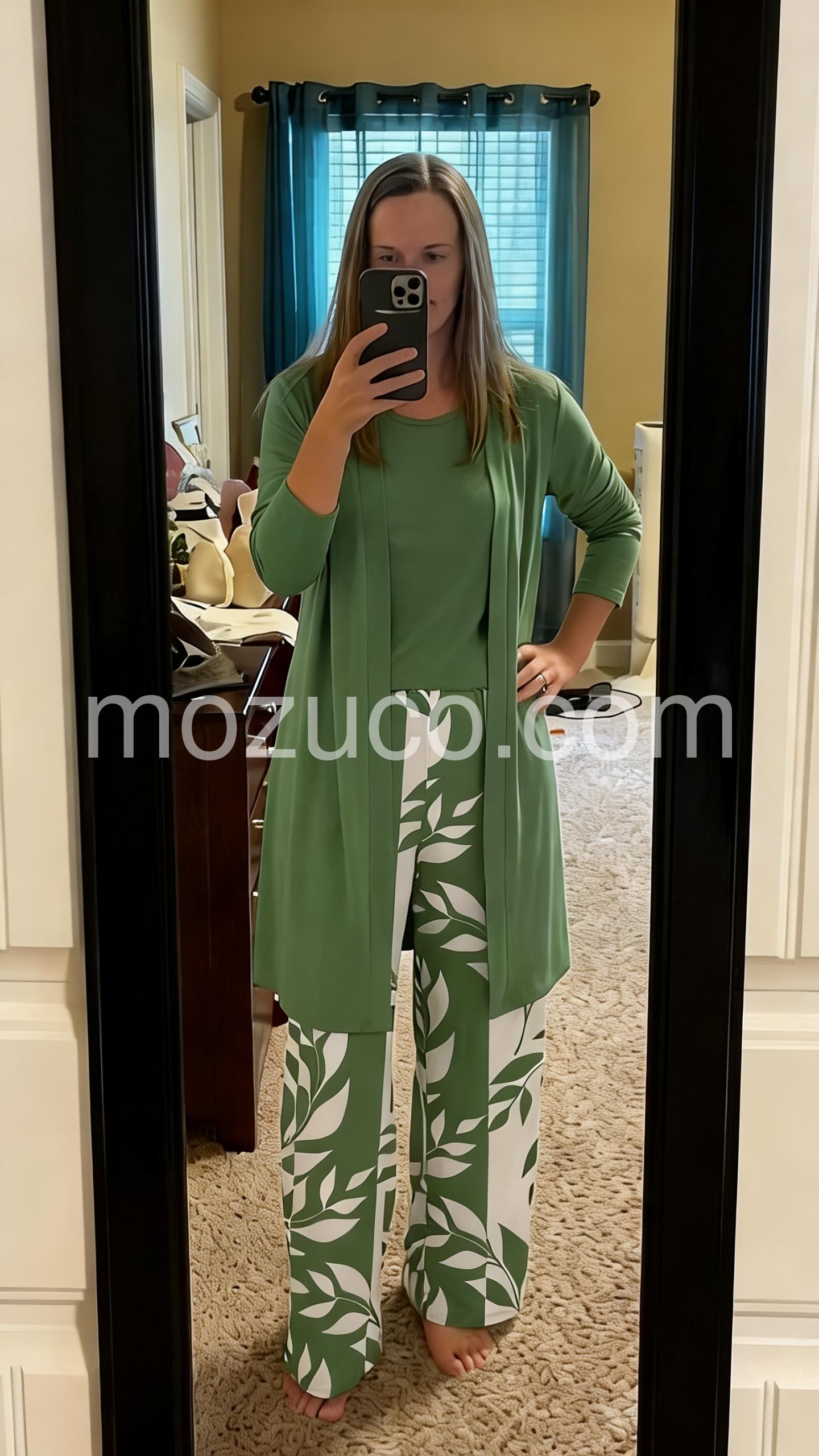 This three-piece set features leaf-patterned wide-leg pants in white and green, paired with a solid green top and open-front cardigan. The relaxed fit offers comfort and elegance. Perfect for casual outings or smart-casual events. Lightweight fabric ideal for warm weather. Effortlessly chic and easy to wear.