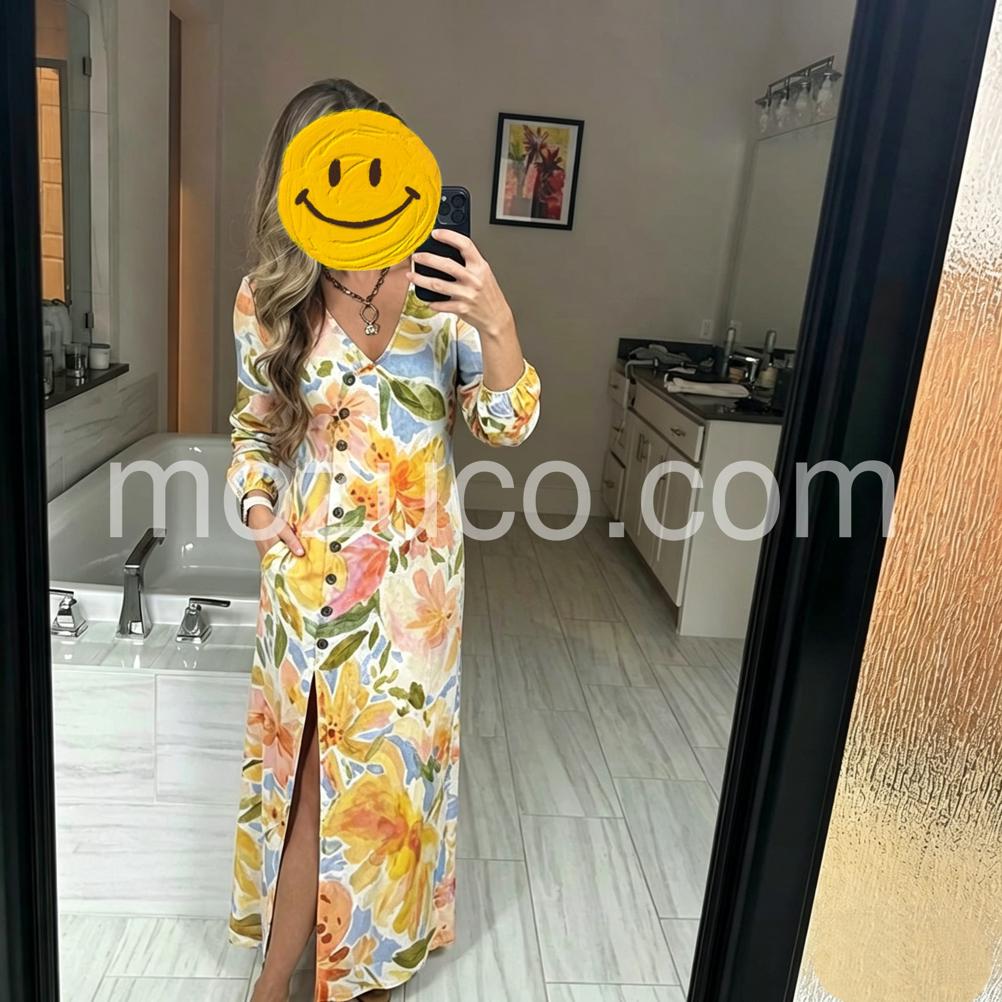 This dress is so flattering. It cinches just enough at the waist to give you shape without being tight. The buttons stay securely closed over the bust. The watercolor design is simply stunning in person.