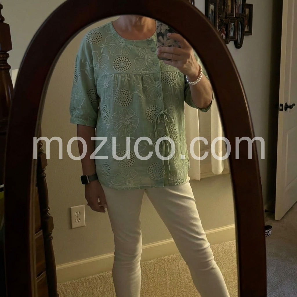 Perfect for spring and summer. The material is lightweight and breathable, and the eyelet cut-outs add such a nice touch without being too revealing.