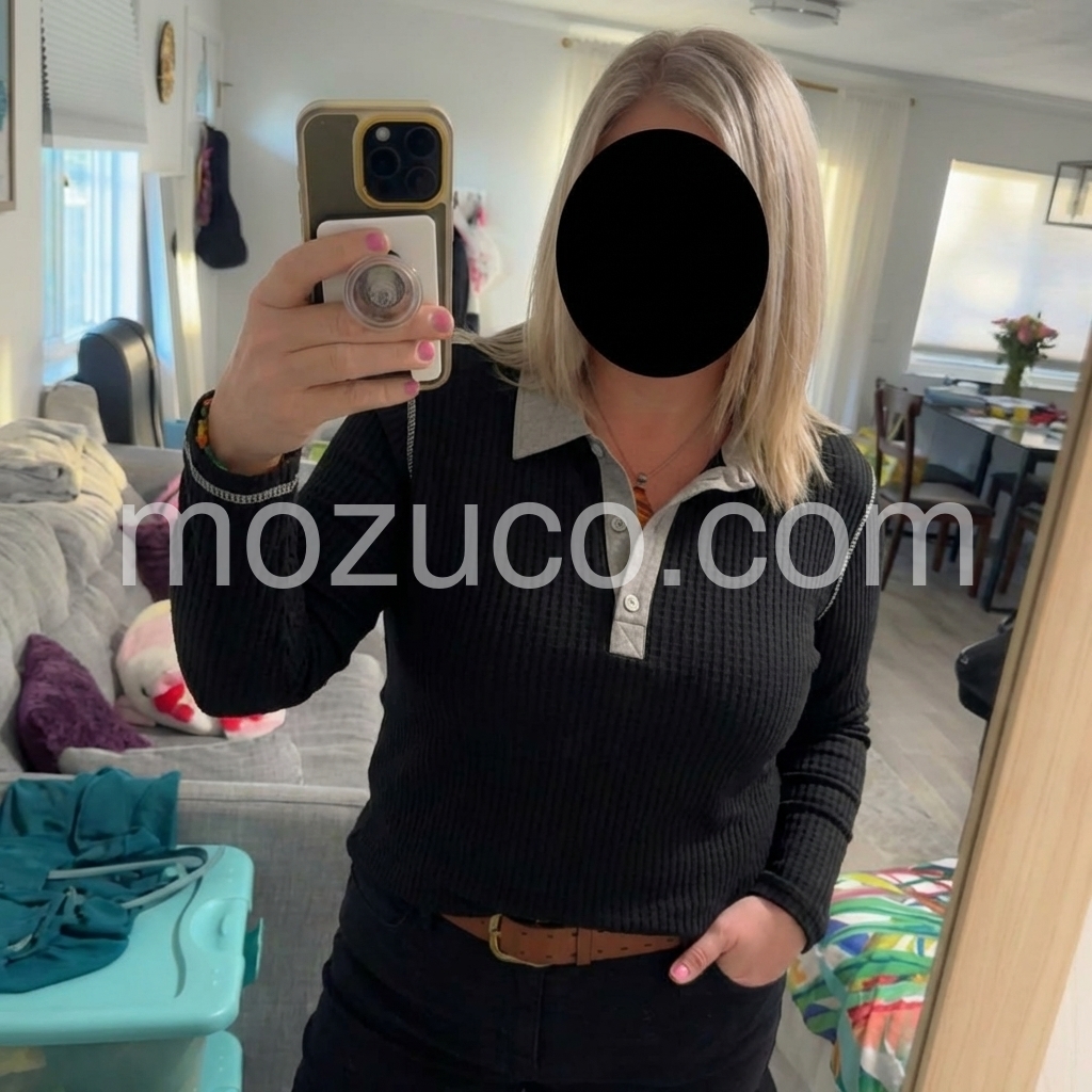This top is such a great find. The black color is elegant and versatile, and the texture feels high-quality. I also really like the design around the collar—those subtle contrast accents make the whole look more interesting without being too loud. It’s warm enough for cool days and still looks stylish.