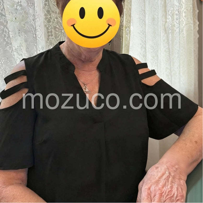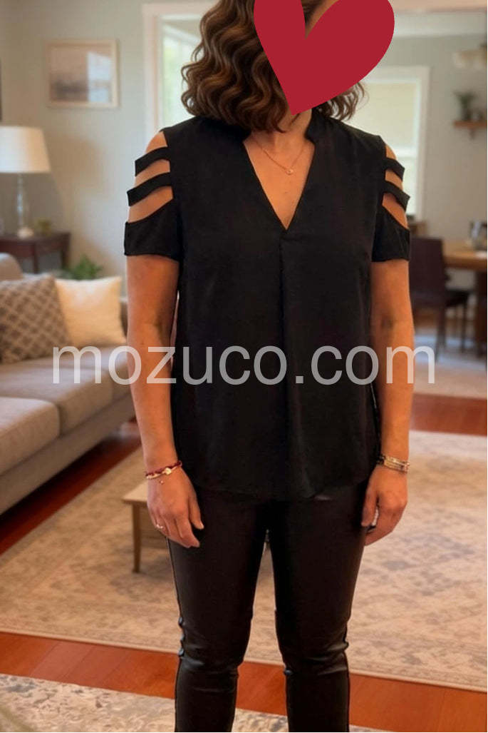 Absolutely love this top! The strappy cutout sleeves add just the right amount of edge while keeping it classy. It drapes beautifully and is so comfortable. Highly recommend!