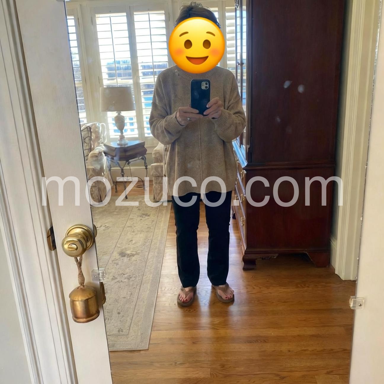 Nice longish sweater! Soft and TTS! The length and width are forgiving and not form fitting. The sweater falls to the hip bone.