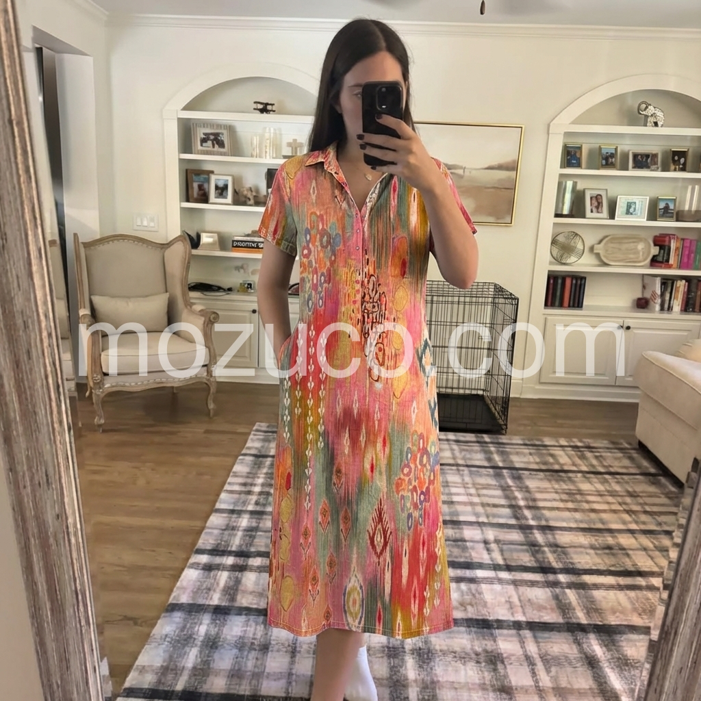 Absolutely love this dress! The colors are just as vibrant as the picture. The best part? It has pockets! It is incredibly comfortable and the linen-like fabric is perfect for hot summer days. Highly recommend!