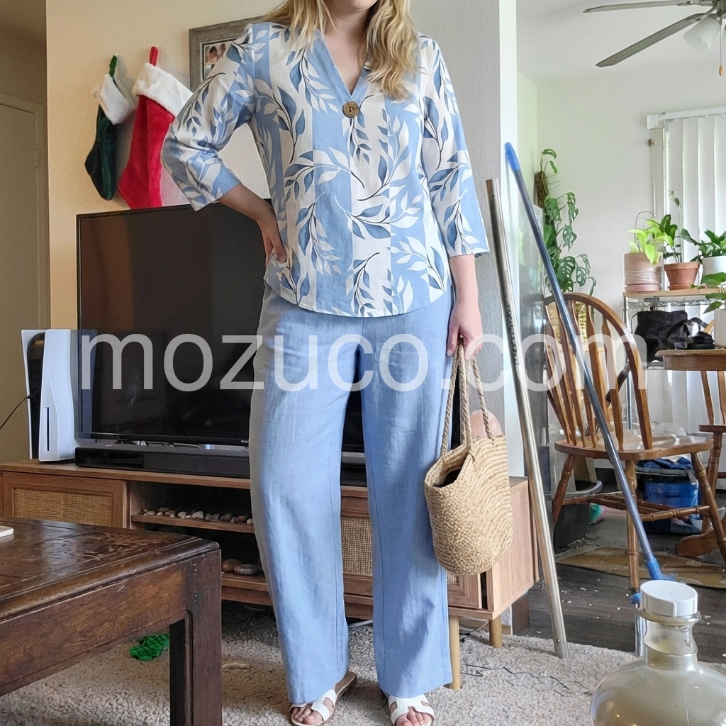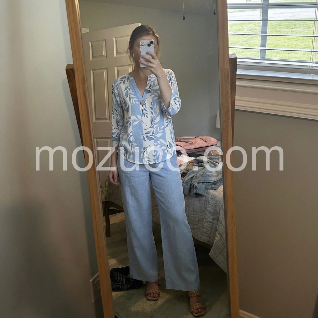 I bought these pants for an upcoming vacation, and I'm so glad I did. They are lightweight, comfortable, and the light blue shade is beautiful. They pair perfectly with the matching top.