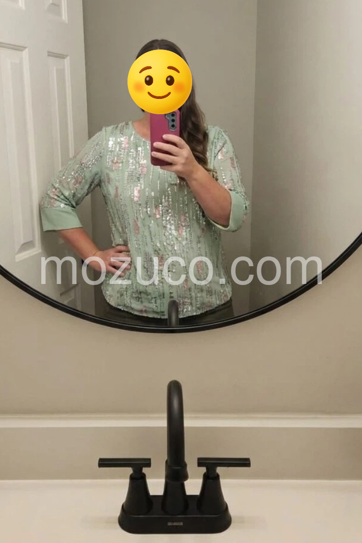 This top is absolutely stunning! The mint green color is so refreshing, and the sequins add just the right amount of sparkle without being overwhelming. Perfect for my upcoming holiday party. Fit is true to size.