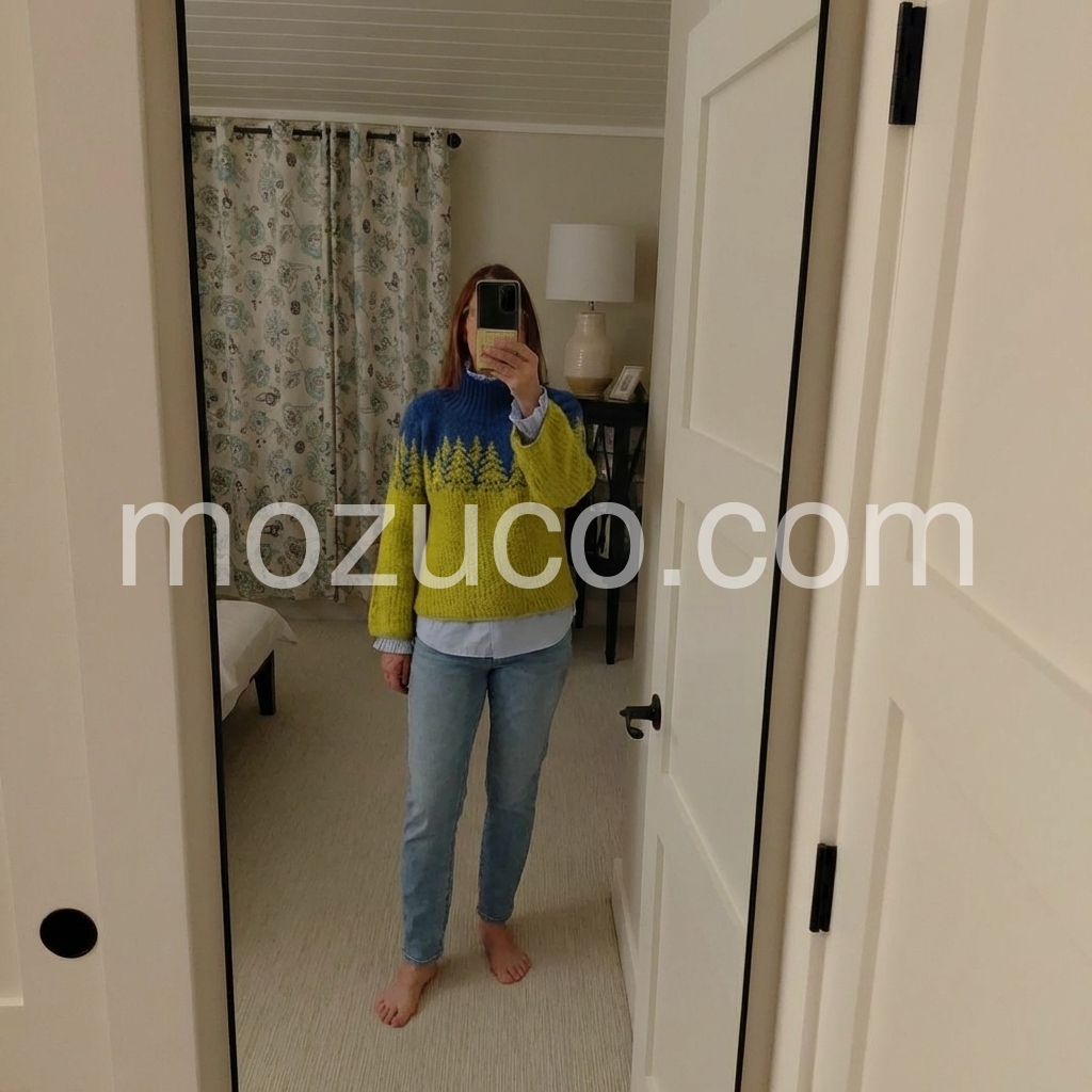 Great purchase! This sweater is incredibly soft and warm, perfect for cold weather. The design is so cute—those little trees are such a sweet detail, and the color contrast is bold but stylish. The bell sleeves are a nice touch, adding a feminine flair without being too frilly. It fits well, not too tight or too baggy, and the high neck is great for blocking out the wind. I’ll definitely be buying more colors if they become available!