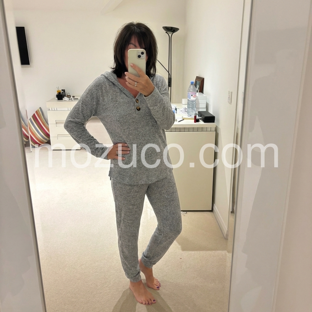 This loungewear set is the coziest thing I own! The hooded top is soft and lightweight, the buttons are a cute detail, and the joggers fit perfectly without being tight. The fabric is breathable and warm enough for chilly nights, and I love the side slits on the top for extra comfort. I wear it around the house all the time.