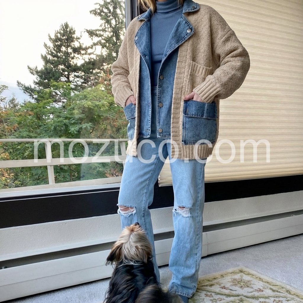 This jacket is a fun addition to my wardrobe! The look is unique with the combination of sweater and demin. The jacket is quite warm and perfect for throwing over a T-shirt and walking the dog on cool days. It is casual, but would also be fine for running to the store or grabbing coffee with a friend. Could be dressed up a little bit with a blouse underneath and a boho necklace. Whenever I put this on, I feel warm and cozy. That's the best part!