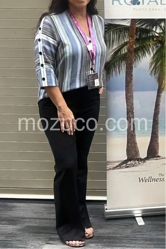I absolutely love this striped blouse! The blue and grey tones are so pretty and versatile. The v-neck is flattering without being too deep, and it looks great with my favorite pair of jeans. The button details on the sleeves give it an extra touch of style. Highly recommend!