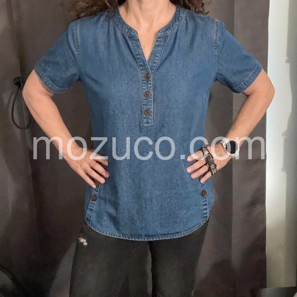 I absolutely love this top! It has the look of denim but is so much softer and more lightweight. The button details on the front and sides add a really cute touch. Fits perfectly and is super comfortable for everyday wear.