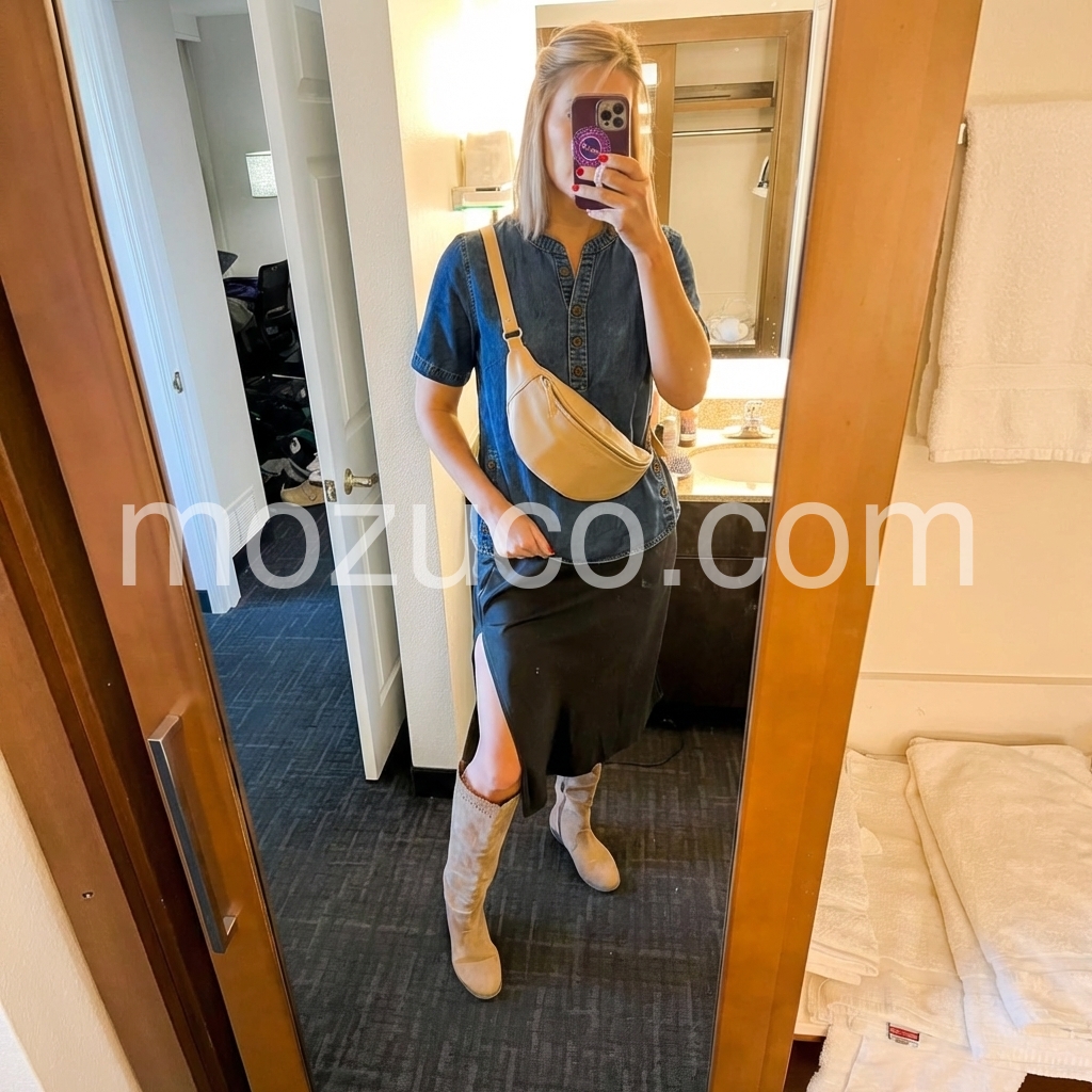 This is my new favorite weekend shirt. It is so easy to throw on and instantly look put together. It did not wrinkle much in my suitcase either, which makes it perfect for travel. The faux denim style is very trendy right now.