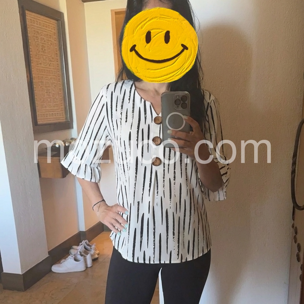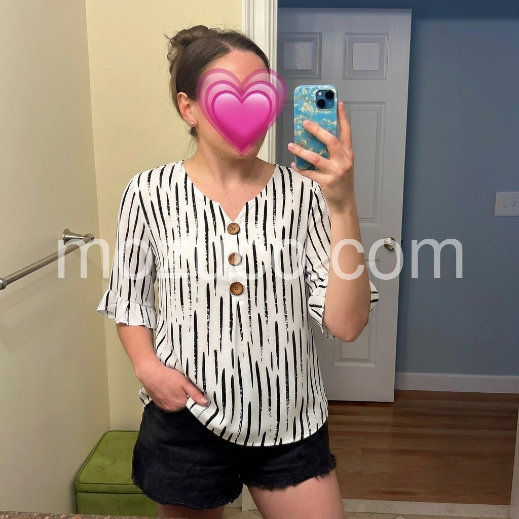 I am absolutely in love with the ruffle sleeves and those cute wooden buttons down the front! It adds such a nice boho touch. The v-neck is flattering and not too deep. Highly recommend for a casual day out.