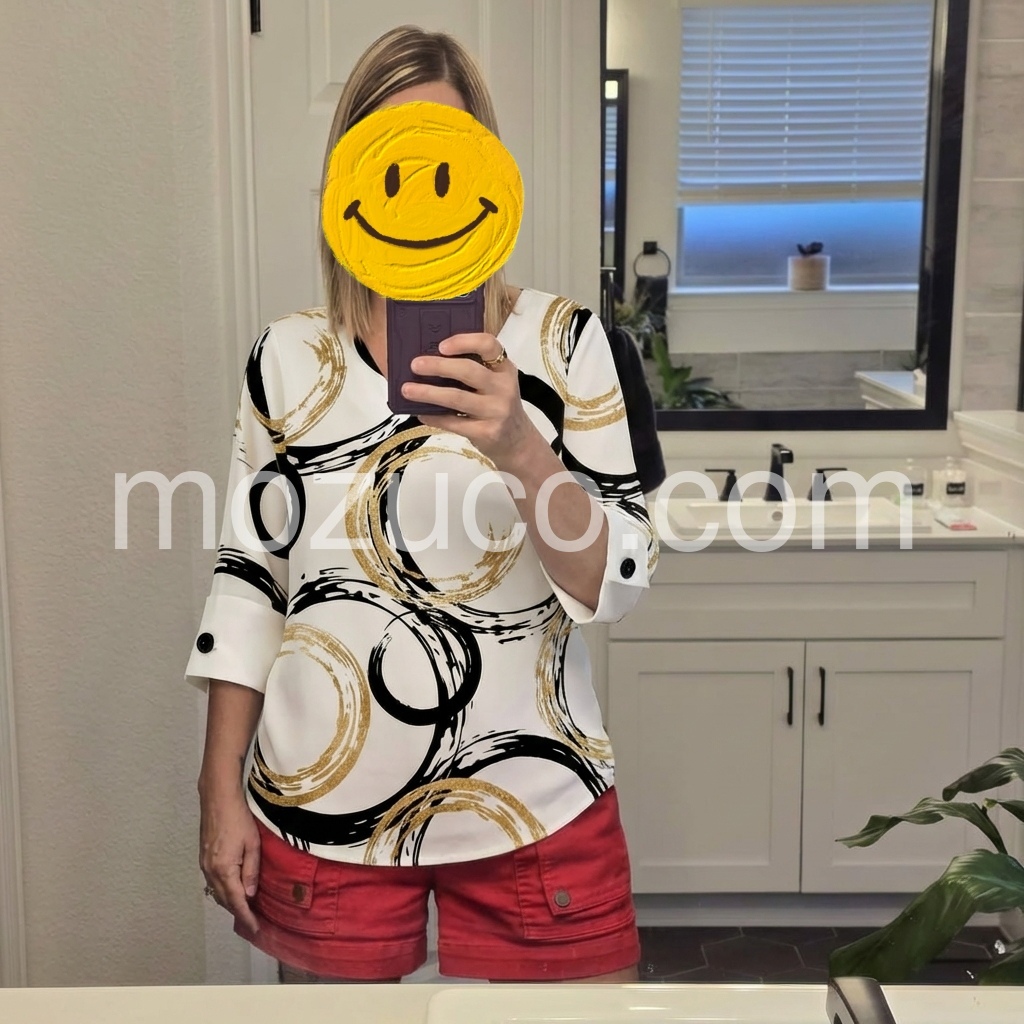 Gold Black Circle Print V-Neck Cuffed Sleeve Blouse