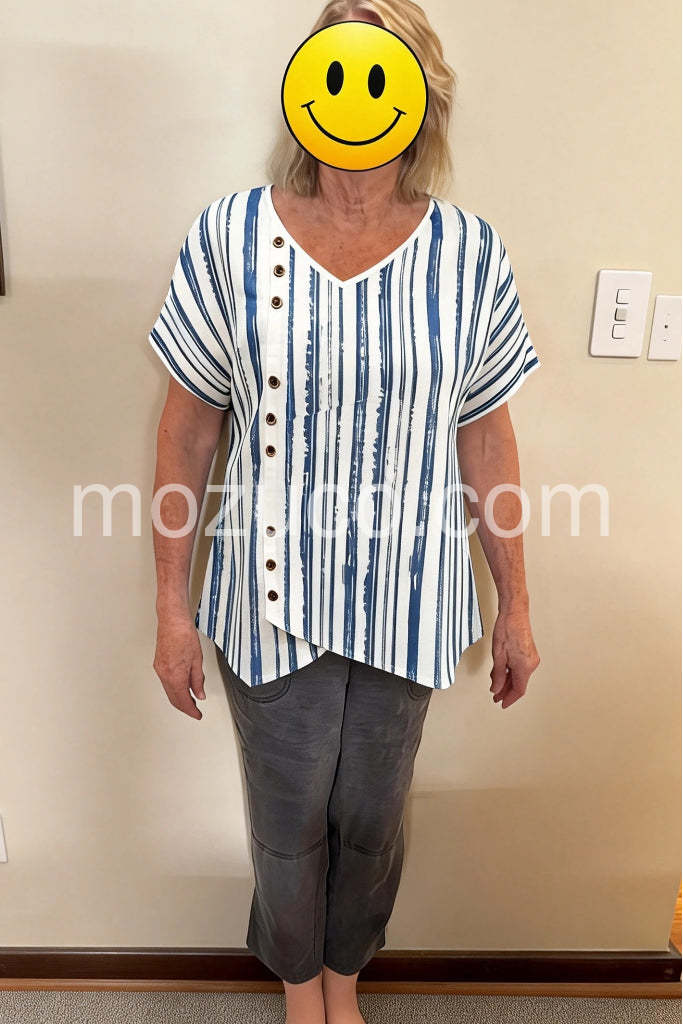 I absolutely adore this blue and white striped blouse. The vertical stripes are incredibly flattering, and the asymmetrical button detail down one side adds just the right touch of uniqueness. I paired it with light khaki shorts for a weekend brunch, and the fit was relaxed yet polished. The fabric feels breathable, and I appreciate how easy it is to dress up with a necklace or down with simple sandals. Highly recommend!