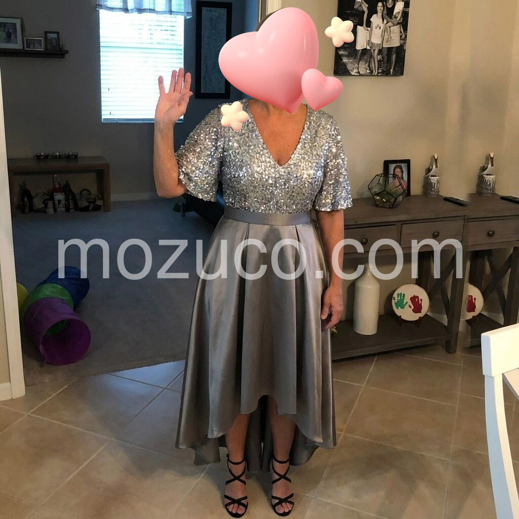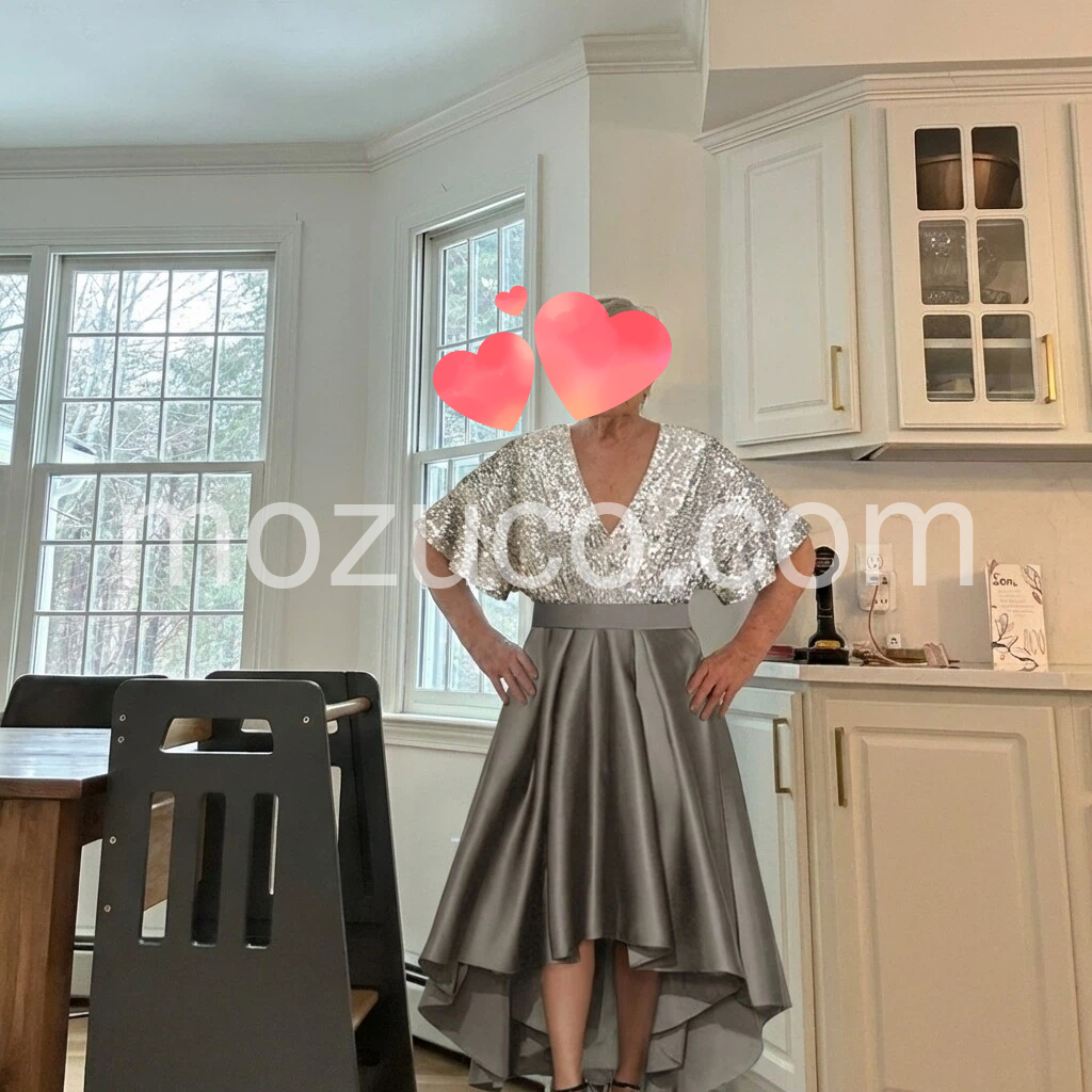 I absolutely love this dress! The silver sequins are gorgeous and really catch the light, and the V-neck looks so flattering. The skirt has a beautiful flowing shape and it feels comfortable to wear. I wore it for a special event and got so many compliments—looks exactly like the photos. Great quality!