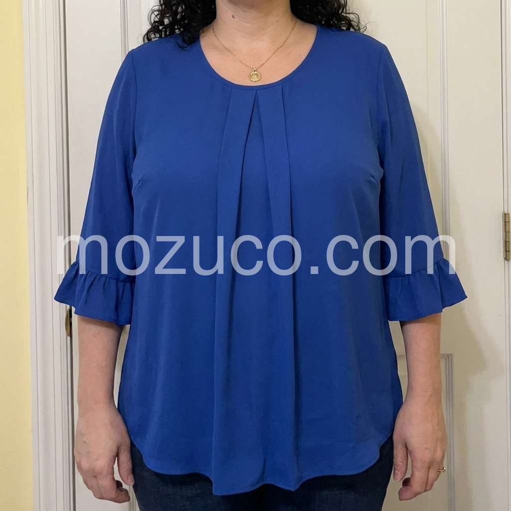 Love the ruffle 3/4 sleeves! It is perfect for the office but looks great paired with jeans too. Very versatile top.