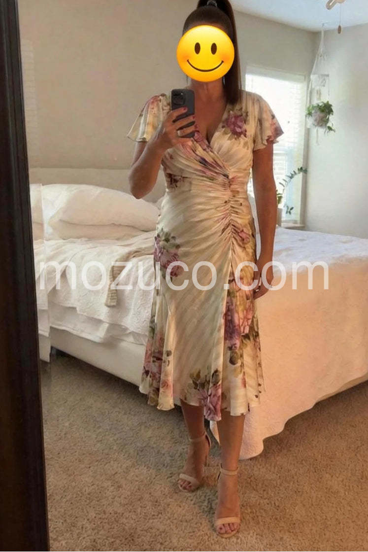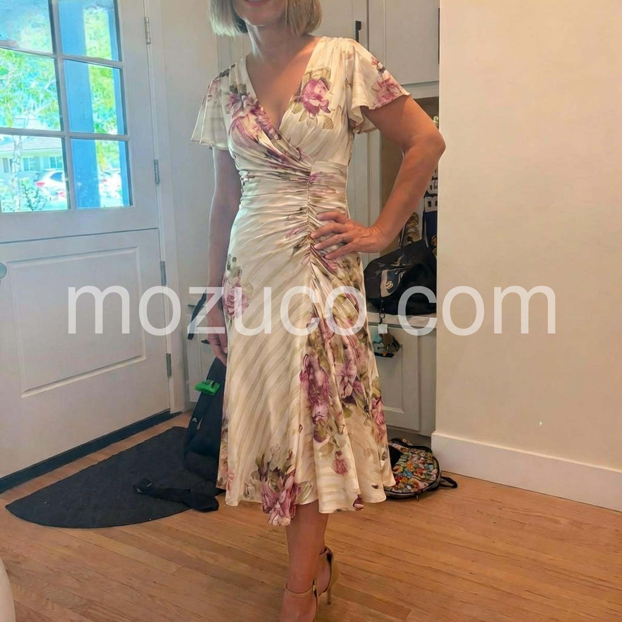 This is a very Beautiful, Comfortable and Stylish dress. The flutter sleeves and floral make the dress look retro and classic. Great style and fabric! Love the length of this dress. Such a nice spring/summer dress! I will get this dress to wear for Easter dinner and I love the look and feel of this dress!