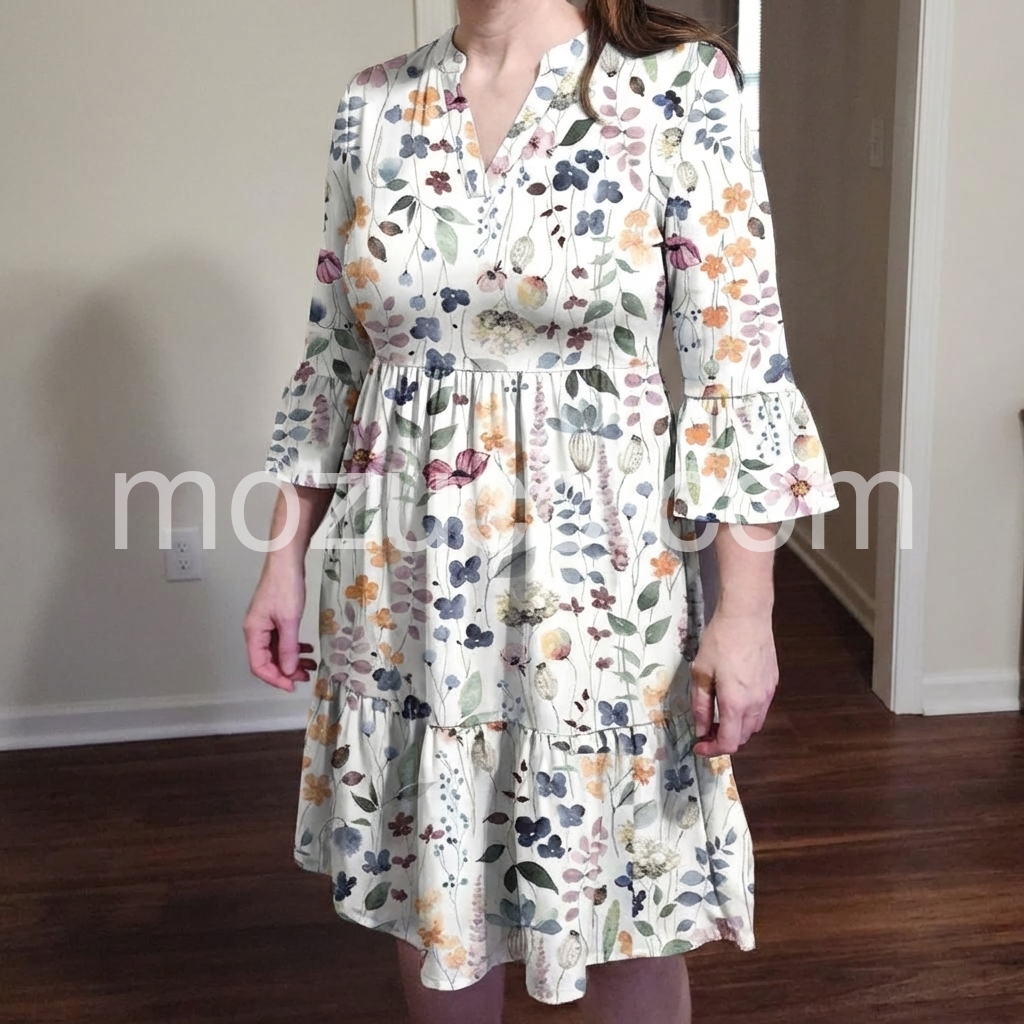 I like this dress more than I expected. I'm not a fan of this bell style sleeve but it looks good. The top is fitted with a flare skirt and it fits well and is true to size. The material is good quality and has enough give to be comfortable.