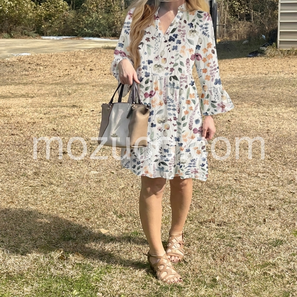 This dress is everything I hoped for. The pastel flowers on the white background are so fresh for spring. It fits nicely through the shoulders and then flows out, making it very forgiving.