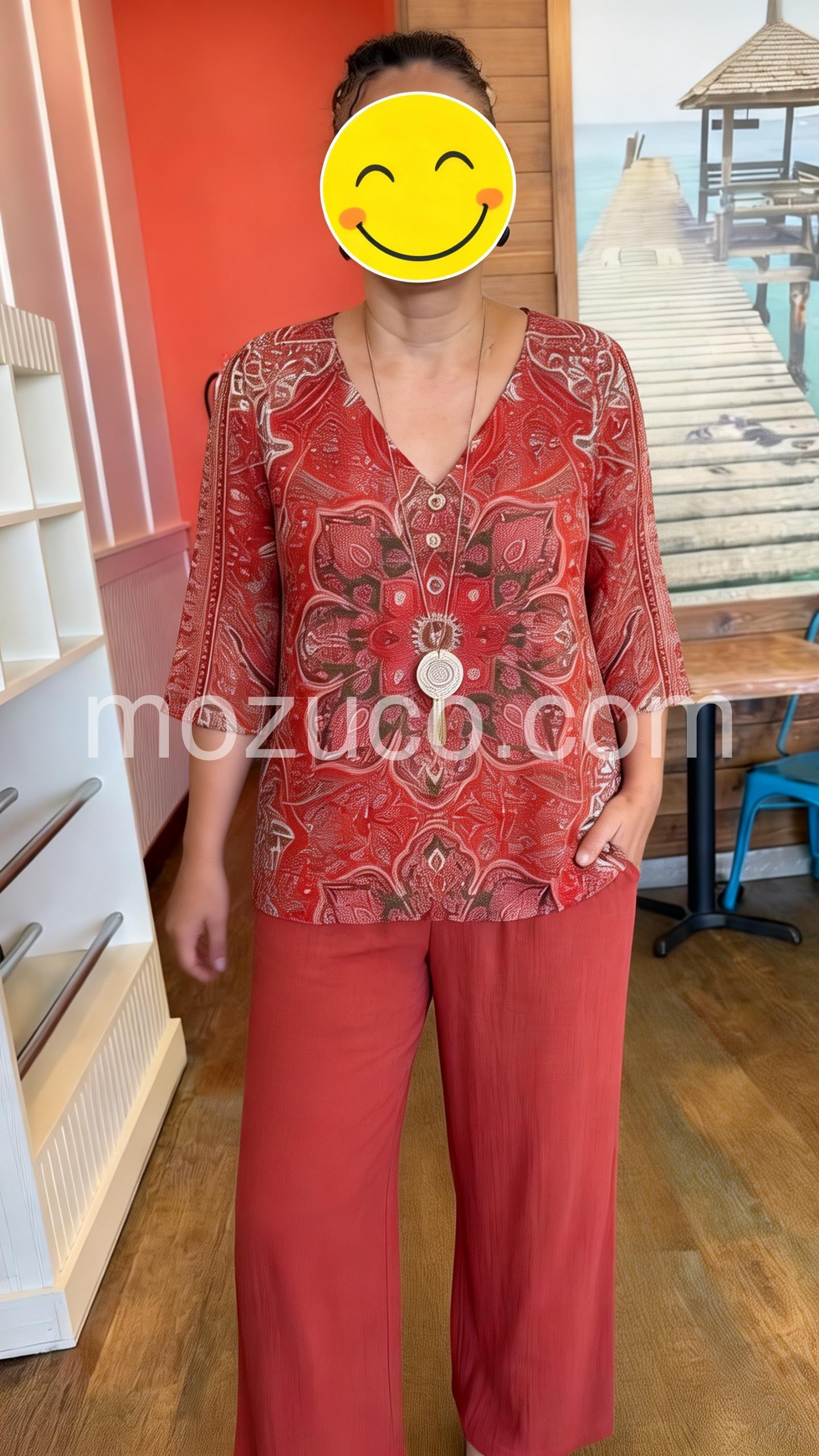 Such a versatile set! The boho print top looks amazing with the matching pants, but I also wear it with my favorite jeans. The pants are lovely with a simple white tank top. Great value for getting two quality pieces.
