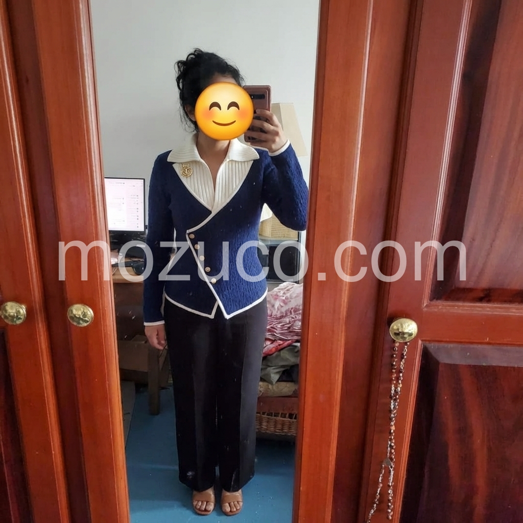 I’m so happy with this purchase. The sweater design is stylish and distinctive, especially with the contrast collar and the gold buttons. It feels soft and cozy, yet still structured enough to look polished. I appreciate how it holds its shape and looks neat even after wearing. Overall, it’s a fantastic item.