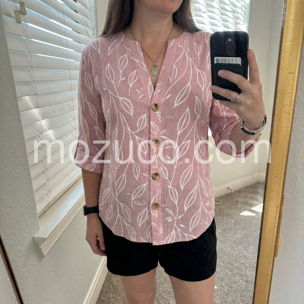 I absolutely love this top! The dusty pink color is so flattering, and the white leaf pattern gives it a fun, tropical vibe. It fits true to size and is incredibly comfortable for hot summer days. I wore it with white denim shorts just like the model, and got so many compliments.