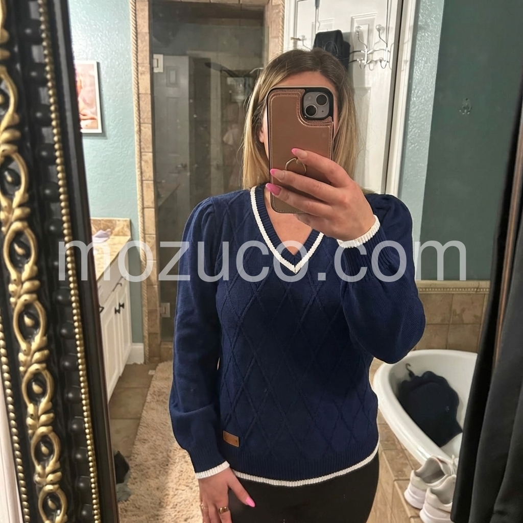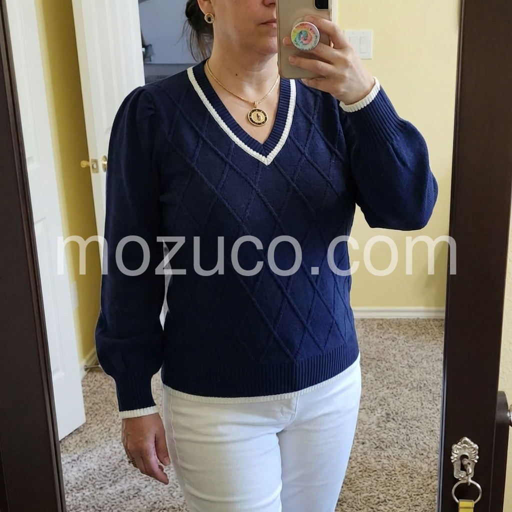 I’m obsessed with this chic navy sweater! The textured diamond pattern elevates it way beyond basic tops, and the contrast white piping makes the design pop. I’ve worn it to the office with slacks and on weekends with jeans—it’s versatile enough for every occasion, and it’s quickly become my go-to fall sweater!