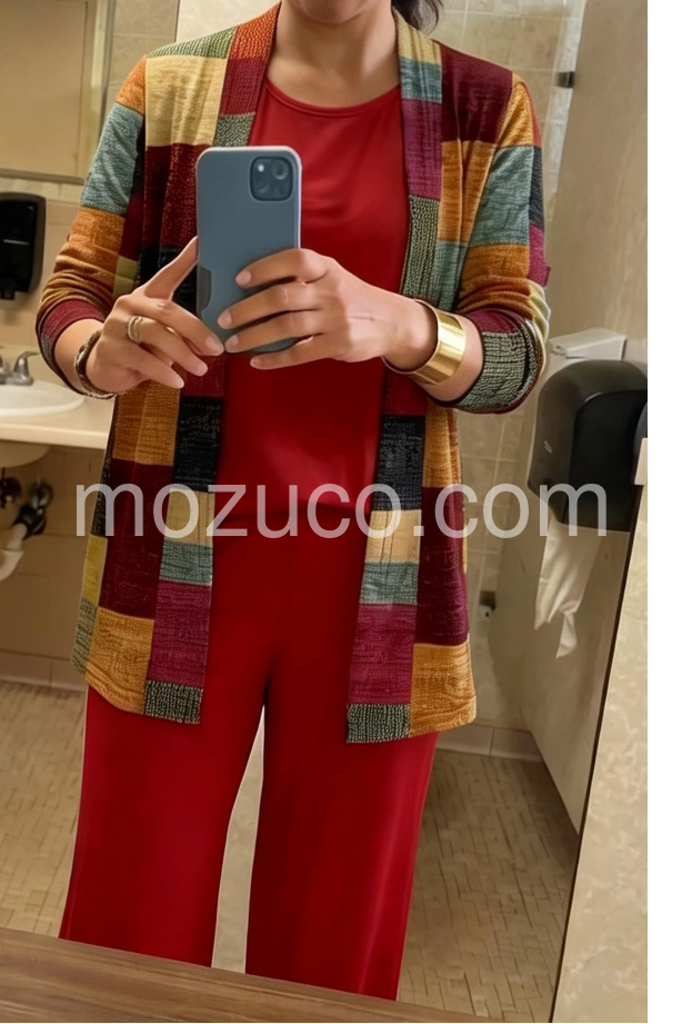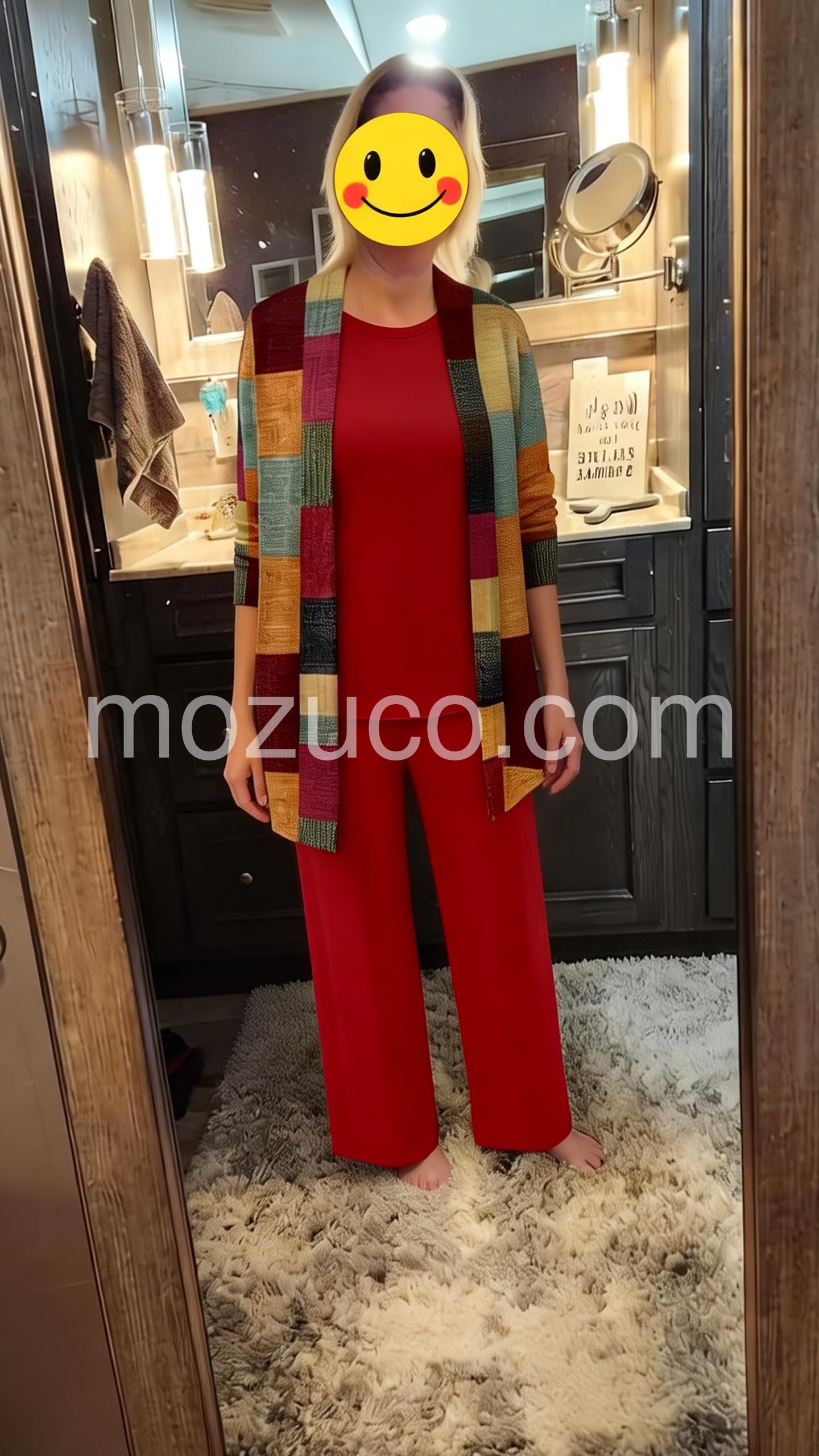 This coordinated outfit features a solid red top and wide-leg pants paired with a vibrant patchwork cardigan. The colorful, geometric design adds a modern touch. Comfortable and chic for casual or semi-formal wear. Perfect for autumn days or stylish outings. Effortlessly elegant with a pop of personality.