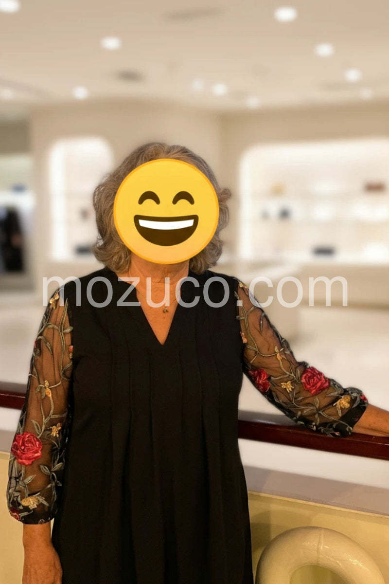 Beautiful dress! I was worried the mesh sleeves might be itchy, but they are incredibly soft and comfortable. The embroidery is stunning in person, with vibrant red roses that really pop. It drapes beautifully and hides my tummy area perfectly.