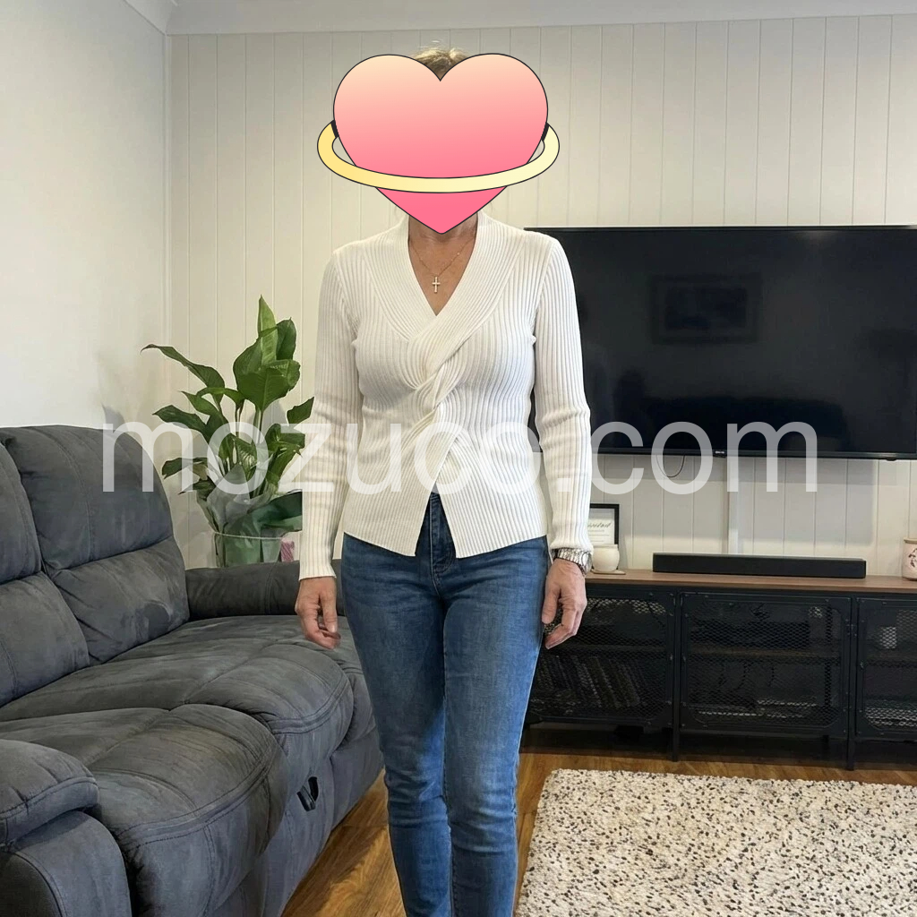 I absolutely love this sweater! The ribbed knit texture looks really nice, and the V-neck is very flattering. It’s lightweight but still warm, and it feels comfortable against the skin. The fit is flattering through the body and the sleeves sit well. I wore it on a beach day and it was perfect for the breeze. It matches the photos perfectly—great quality!