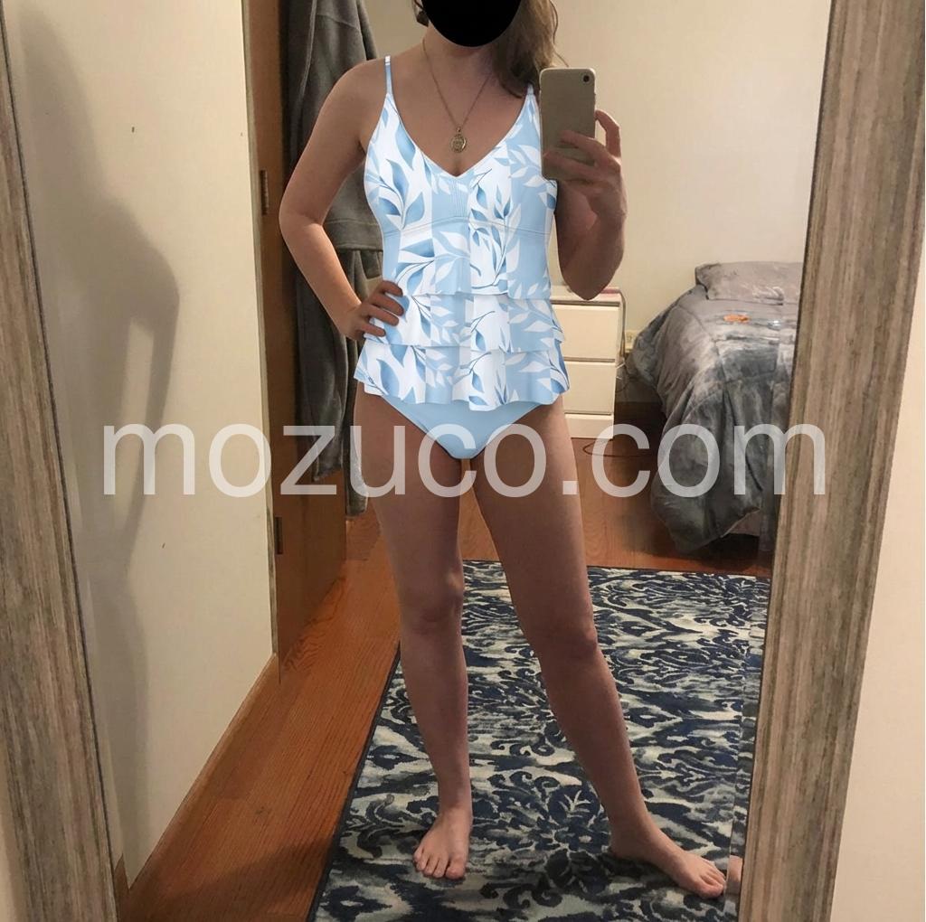 I’m 5’11”, 160#, and normally wear a medium top. I ordered the L. It quickly became my favorite bathing suit, particularly because I have no booty, so the rouching design makes that a little less awkward. 😂