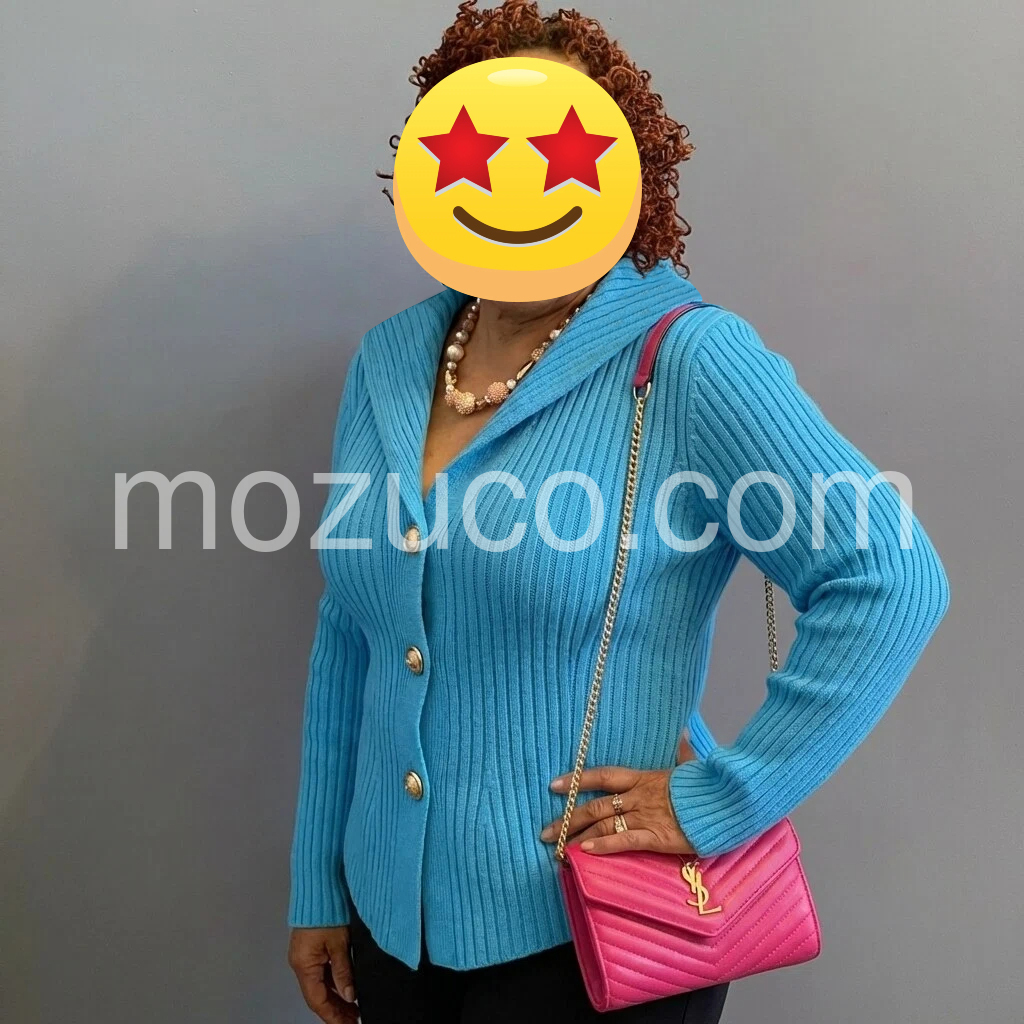 I absolutely love this sweater! The bright turquoise color is perfect for adding a fun touch to my outfits, and the ribbed knit is so soft and warm. The asymmetrical buttons are such a unique design element, and the slim fit is really flattering. It’s easy to dress up with a skirt or dress down with jeans, making it a versatile staple. The fabric is high quality and holds its shape well. Definitely worth buying!
