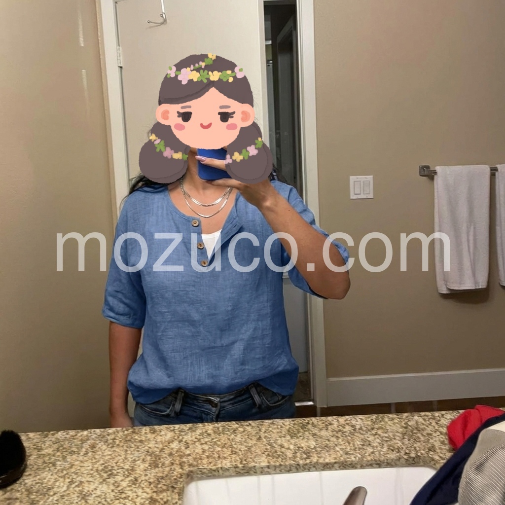 The button details on the V-neck give it a nice touch. Not too low cut, very modest, lightweight, and super comfortable.