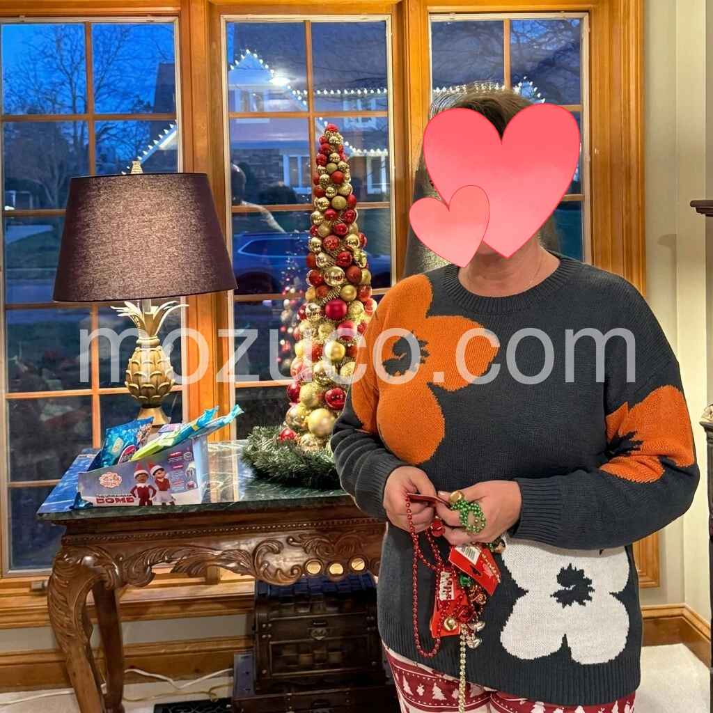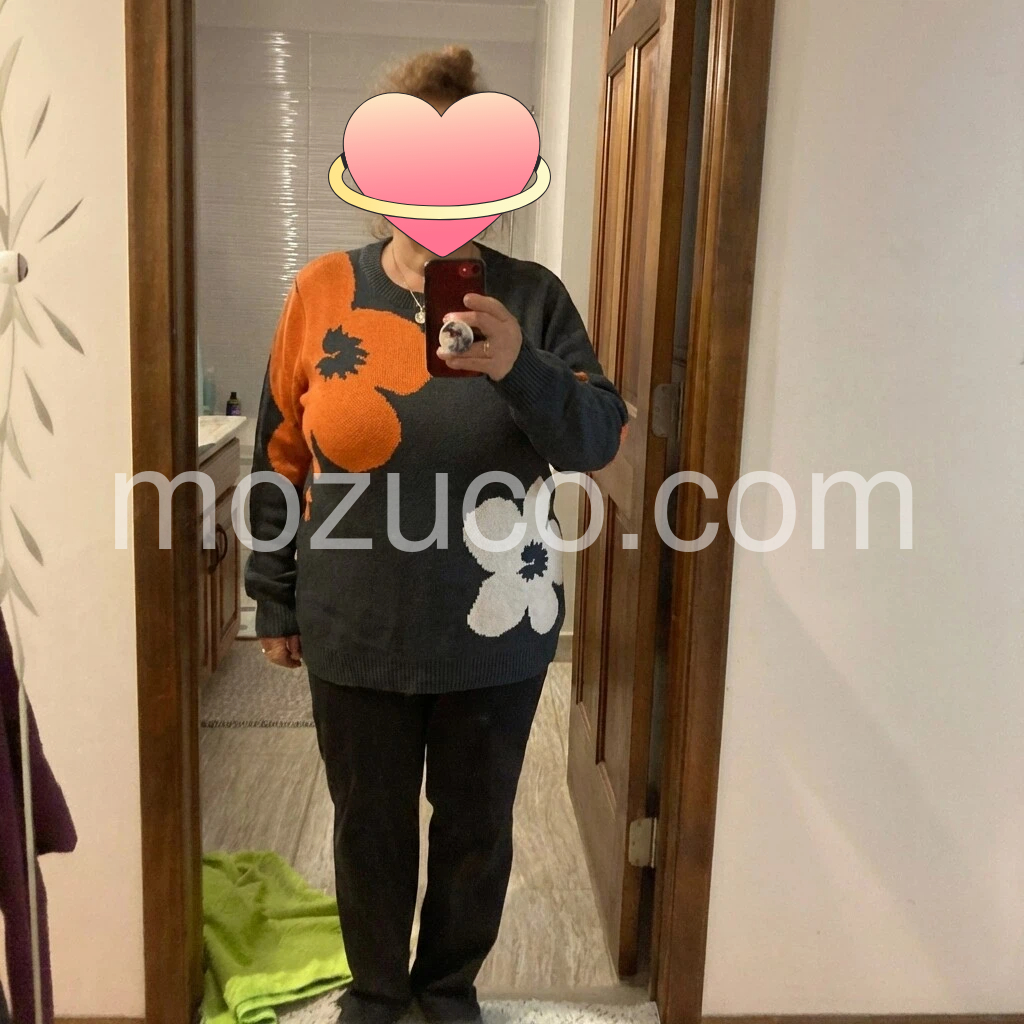 I love this sweater! The colors are fun and festive especially the bright orange animal design against the dark background. The knit looks soft and comfortable, and it fits nicely without feeling stiff. The crew neck sits well and the length is flattering. I’ve worn it casually and it still looks really put-together because the print is so eye-catching. It matches the listing photos well and feels like good quality.