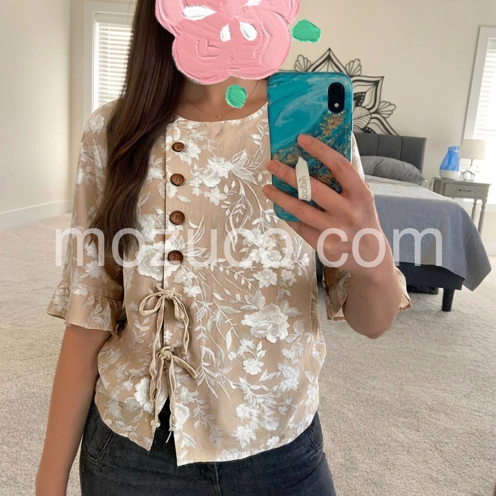 This blouse is gorgeous in person. The white floral pattern against the beige background is very subtle and classy. I wore it to a casual brunch with jeans and felt so put together. The little tie at the bottom is such a cute detail.