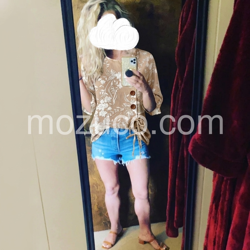 I love clothes with unique details and this top delivers. The asymmetrical cut with the buttons and the bottom ties make it stand out from a basic tee. It is very comfortable and fits my curves nicely.