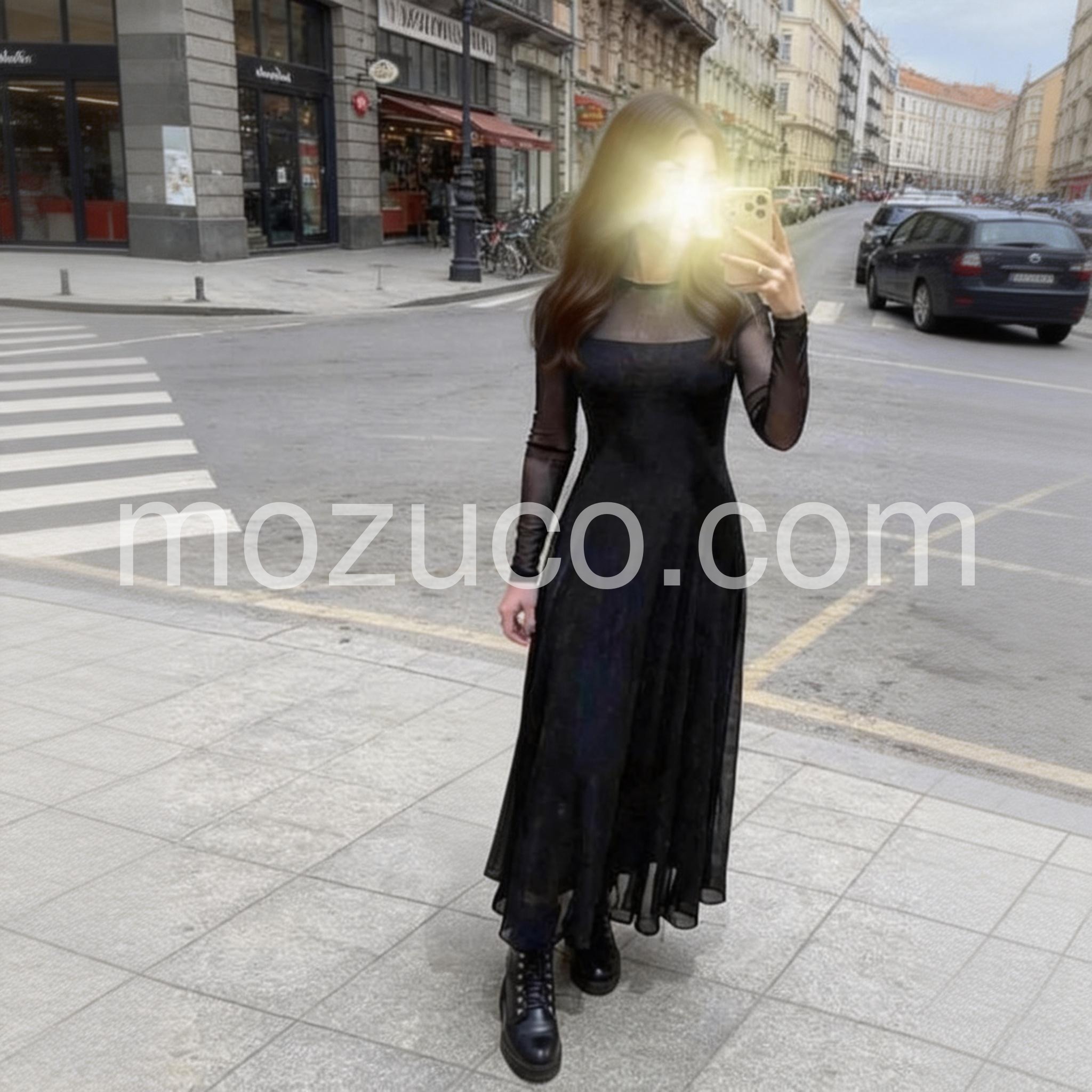 Absolutely in love with this dress! The sheer mesh sleeves give it such a cool, edgy vibe without being too revealing. I wore it to a concert with chunky combat boots just like the model, and it looked incredible. The material is surprisingly soft and flows beautifully when you walk.