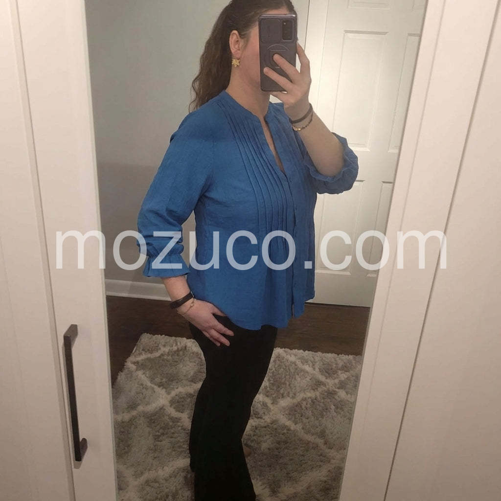 I absolutely love the color of this top! The blue is exactly as pictured and the fit is incredibly flattering. The pleats down the front give it a nice structure while still being flowy and comfortable. Fits true to size.
