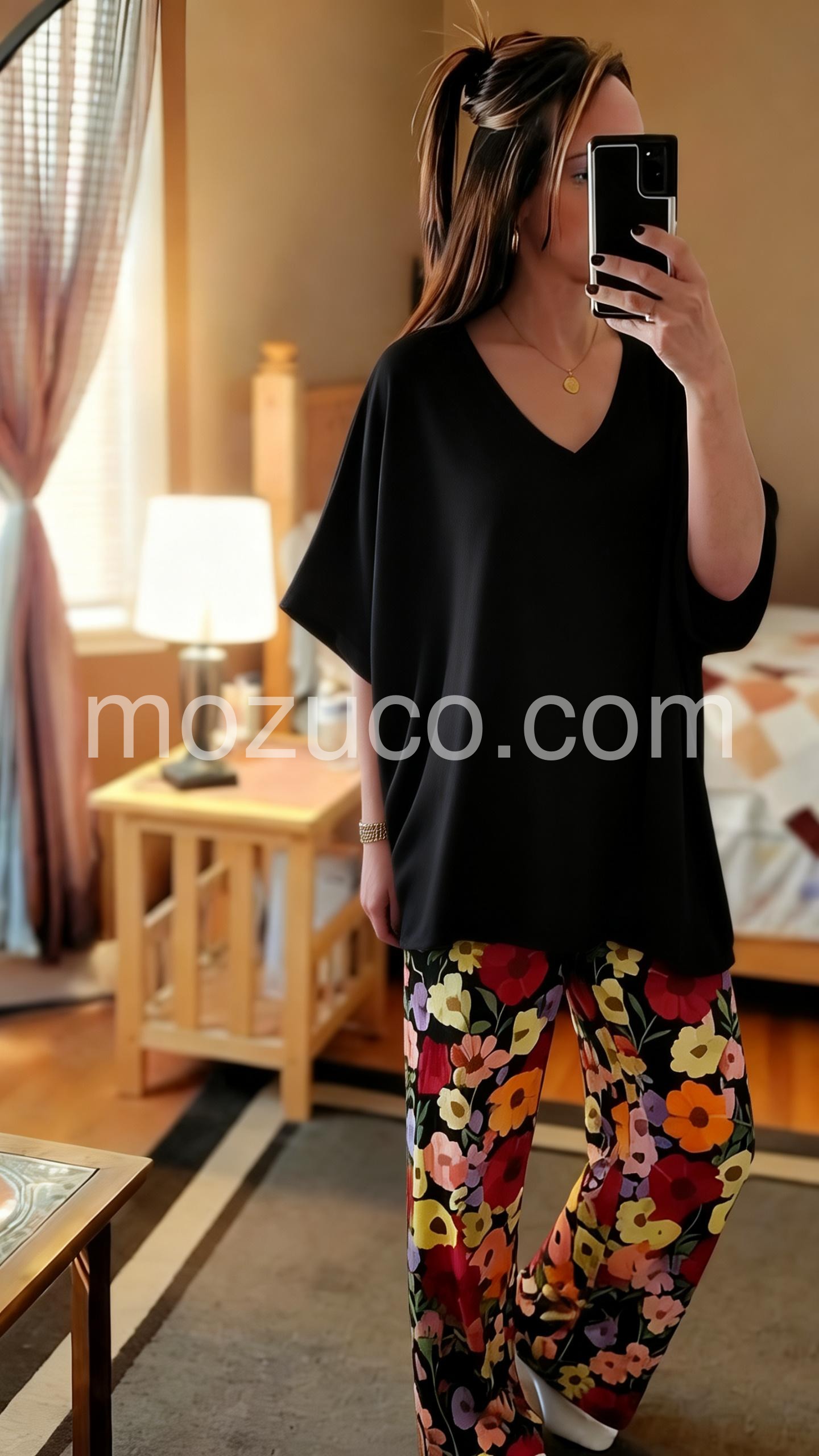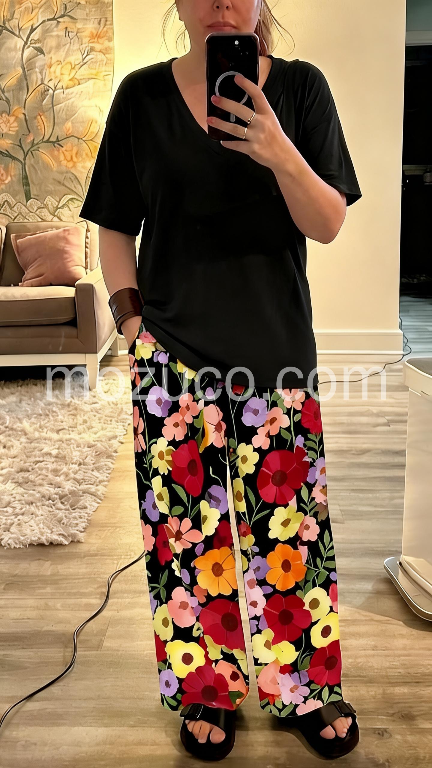 I absolutely love this set! The wide-leg floral pants are incredibly comfortable and breathable, perfect for summer weather. The best part? They have pockets! The black V-neck top is simple but pairs so well with the vibrant bottoms. Highly recommend!