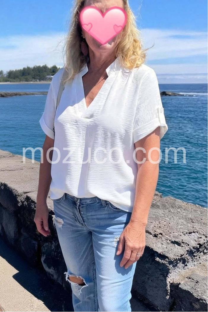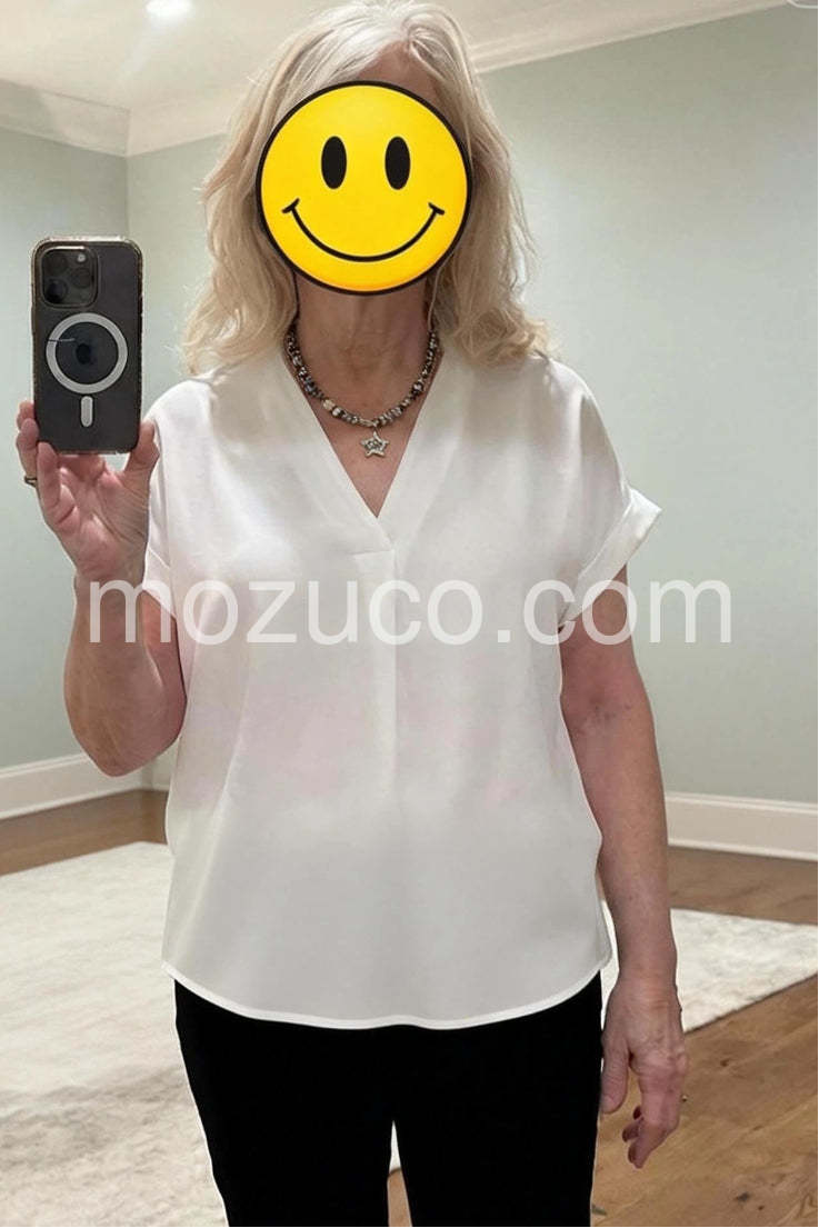 This shirt is so amazingly cute, travels well and can be tucked in or not !! I’ve gotten lots of compliments. The V-neck and short sleeves are flattering and feminine, and the fabric feels comfortable and breathable. Perfect for dressing up or casual wear. Highly recommend!