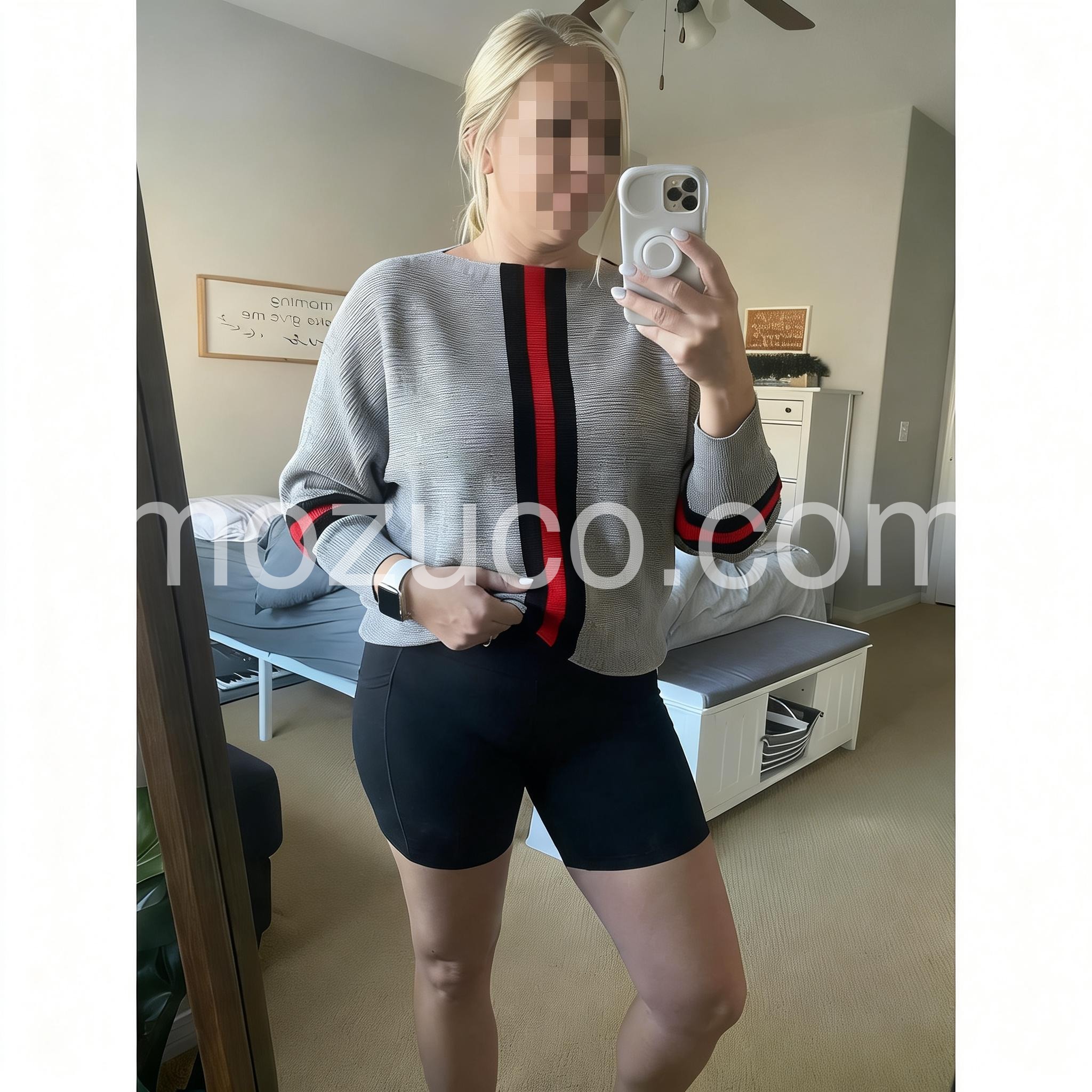 Bold designer-inspired red and black stripes down the front and on the long Dolman sleeves give this classic gray sweater an elevated look. Wear this versatile and comfortable little sweater to just about anywhere for a refined, laid-back style. Pair with black leggings, pants, and boots. Machine wash normal with light colors or hand wash. Bleach if needed. May be hung up to dry or lay flat. Tumble dry with low heat. Light ironing if needed.