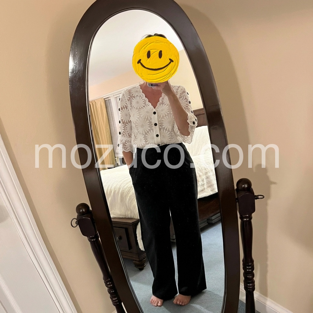 I love the vintage vibe of this lace button-down. The fit is perfect, not too tight across the chest, and the v-neck is just the right depth. A must-buy!