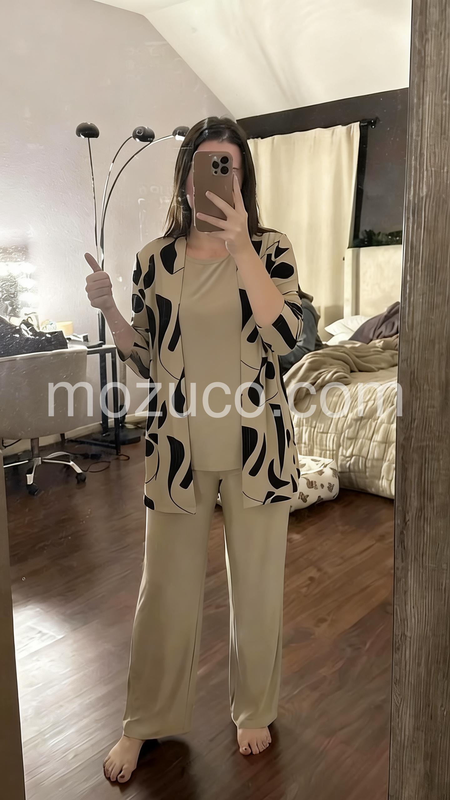 I was hesitant to buy clothing online, but this set exceeded my expectations. The taupe color is stunning and very neutral. The wide leg pants are flowy and do not cling to my thighs. It feels like wearing pajamas but looks incredibly chic for the office.