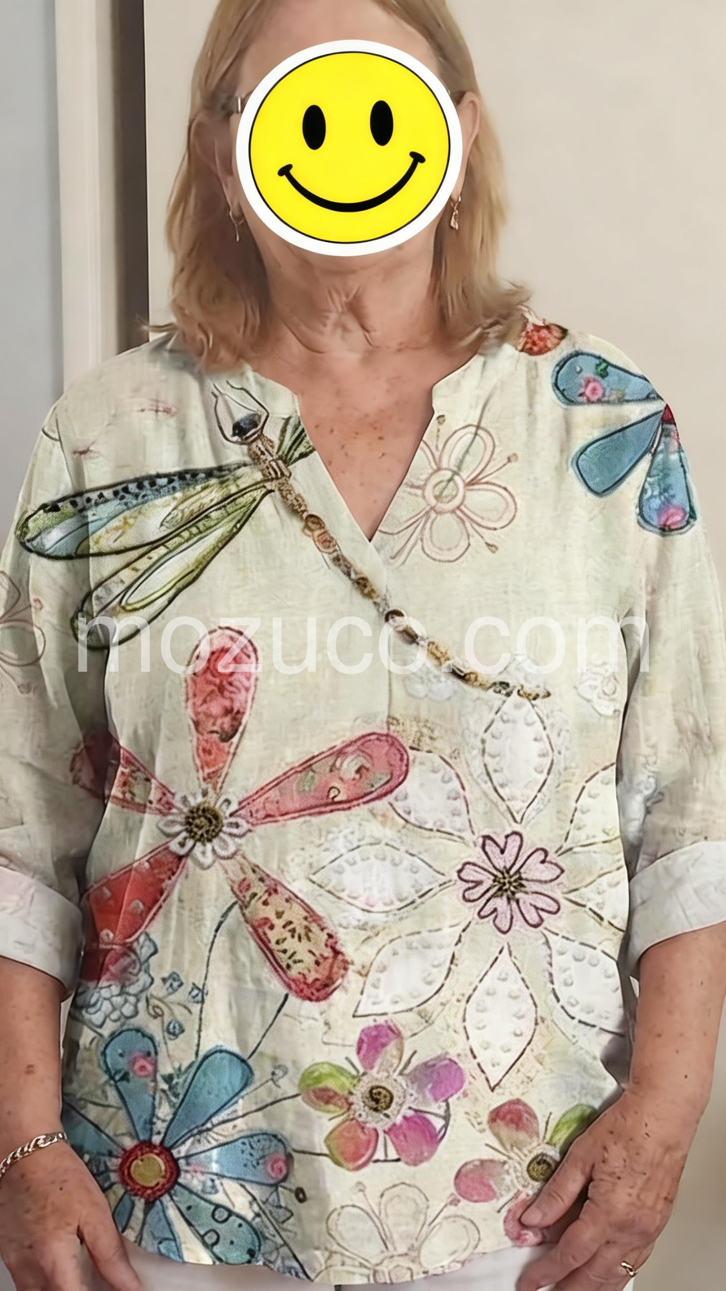 I absolutely love this top! The dragonfly and floral print is so unique and pretty. I have gotten so many compliments on it already. The material is very soft and breathable.