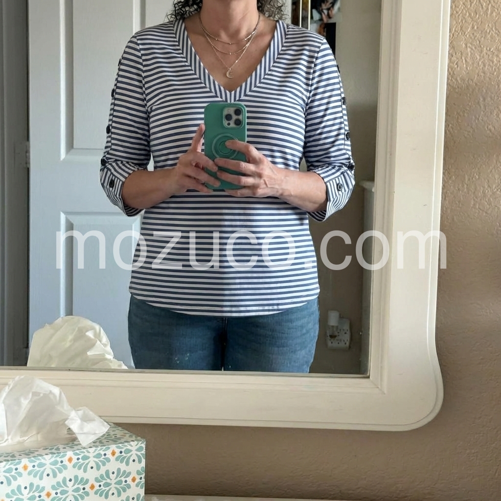 Five stars! This top exceeded my expectations. It is comfortable, stylish, and versatile. The V-neck is just the right depth and the sleeve buttons add a chic touch. Shipping was fast and the packaging was neat.