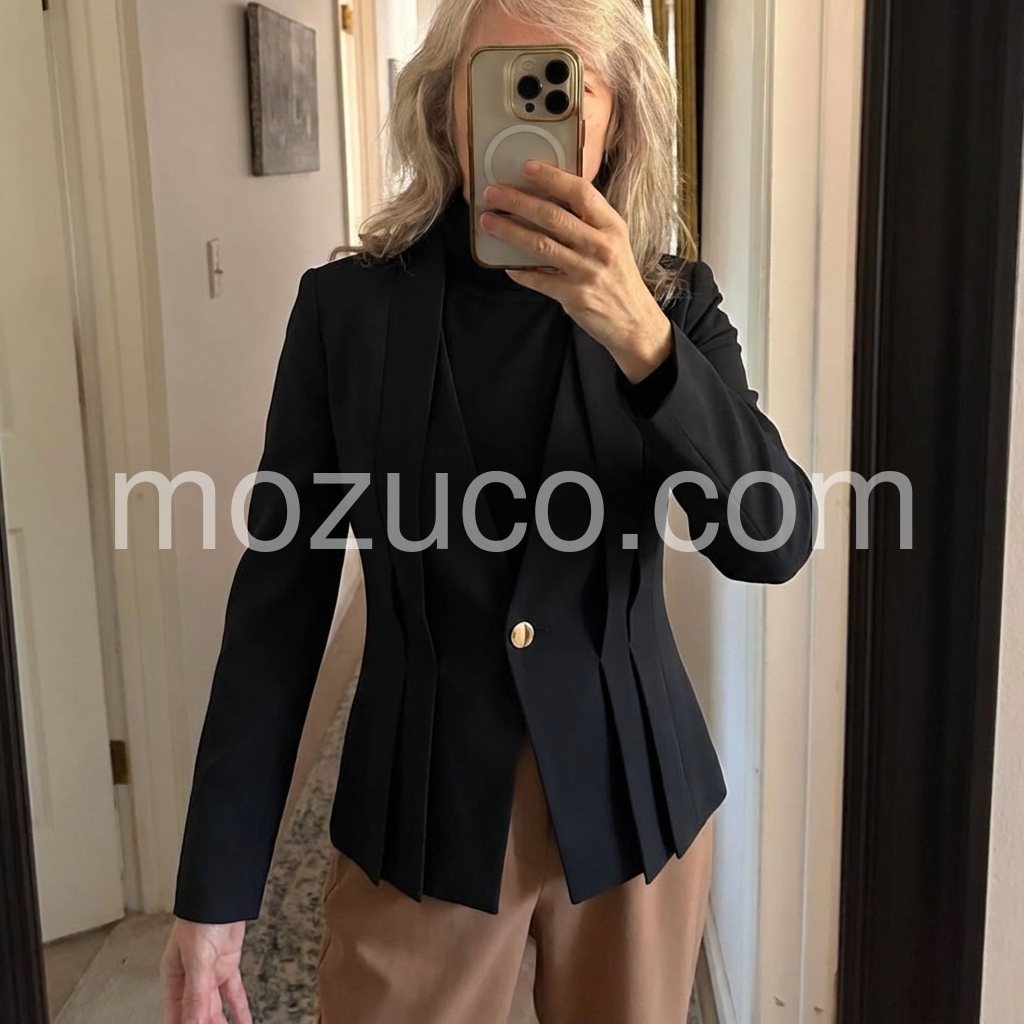 I couldn’t stop talking about how polished this looks. The jacket has a sharp, professional vibe but still feels fashion-forward. The fit is flattering and the lines on the front make the whole outfit look more refined. It’s definitely a statement piece that works for both formal and semi-casual styling.