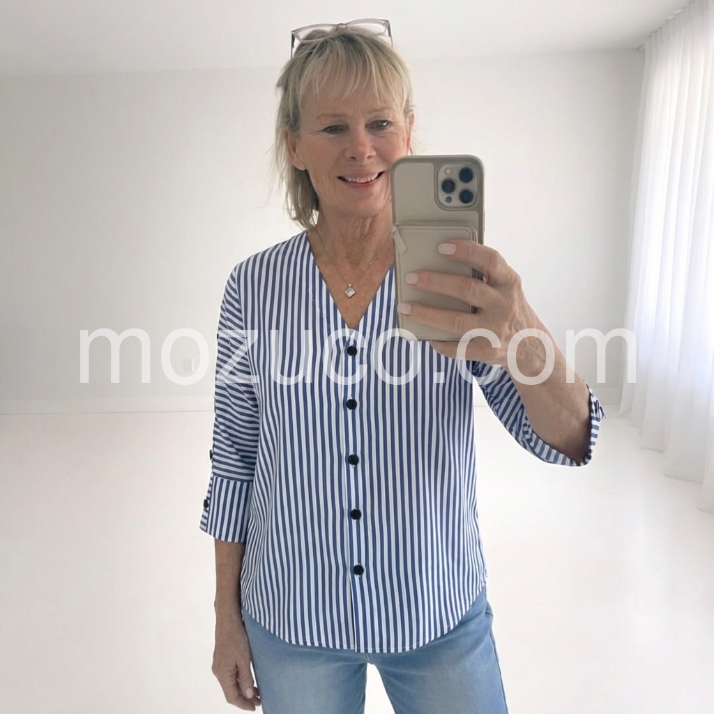 Absolutely love this top! The vertical blue and white stripes are so slimming and the V-neck is just the right depth. It looks great paired with my favorite jeans for a casual day out. The material feels lightweight and breathable too.