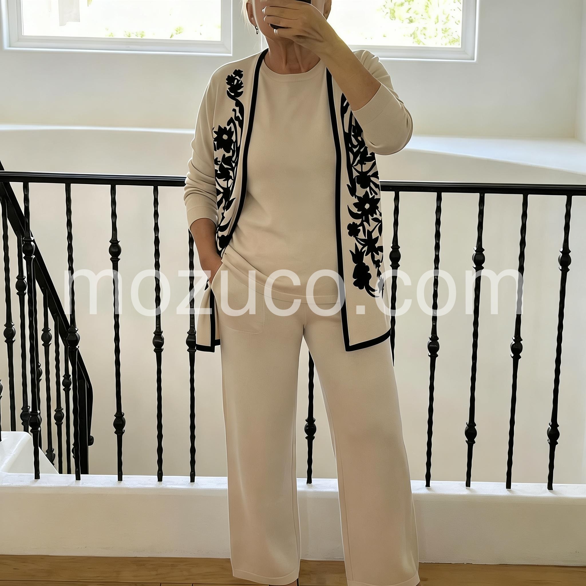 This coordinated three-piece set features a soft beige top, wide-leg pants, and an open-front cardigan with black floral embroidery. The clean lines and subtle contrast create a refined look. Perfect for casual outings or relaxed elegance. Comfortable, stylish, and effortlessly chic.