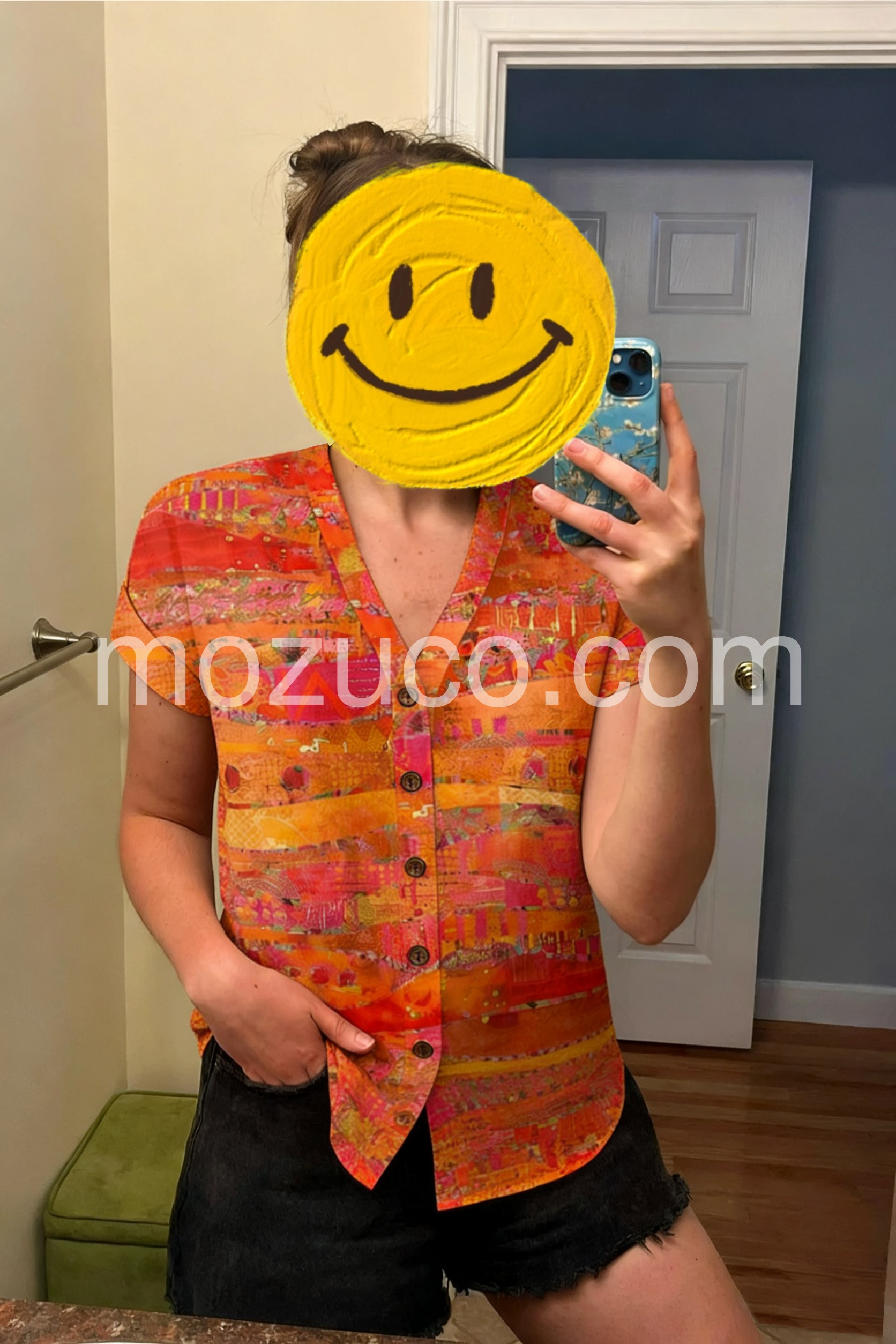 Such a fun and bright top! I bought this for a tropical vacation and it was my favorite piece to wear. It looks great tucked into jeans just like the model shows, but also works well loose over leggings. The buttons are secure and the quality is surprisingly good for the price.